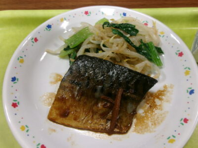 今日の給食は、ご飯(麦入り)、牛乳、さばのみそ煮、もやしと小松菜のごま和え、すまし汁でした。