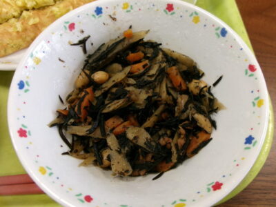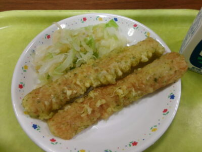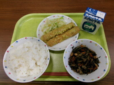 今日の給食は、ご飯、牛乳、ちくわのいそべ揚げ、キャベツとたくあんの和え物、豚肉とひじきの炒め煮でした。