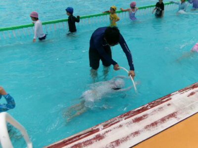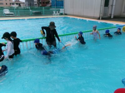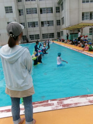 担任たんにんは、プールのなかはいって指導しどうしますので、うえからどもたちの様子ようす見守みまもっていただいています。