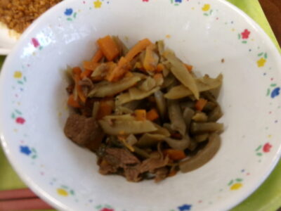 今日きょう給食きゅうしょくは、ごはん麦入むぎいり)、納豆なっとうみそ、きゅうり、牛乳ぎゅうにゅう、ごぼうとこんにゃくいたでした。