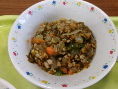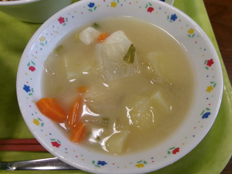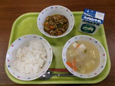 今日の給食は、ご飯(麦入り)、もずく丼の具、牛乳、新じゃがの白みそ汁でした。