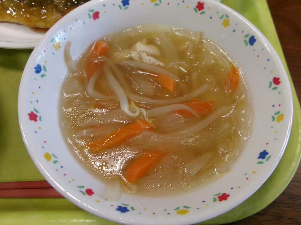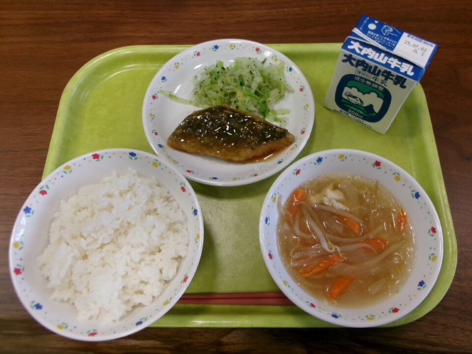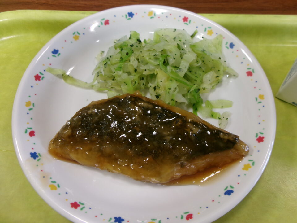 今日の給食は、ご飯、牛乳、さわらの照り煮風、キャベツの青じそ和え、春雨スープでした。
