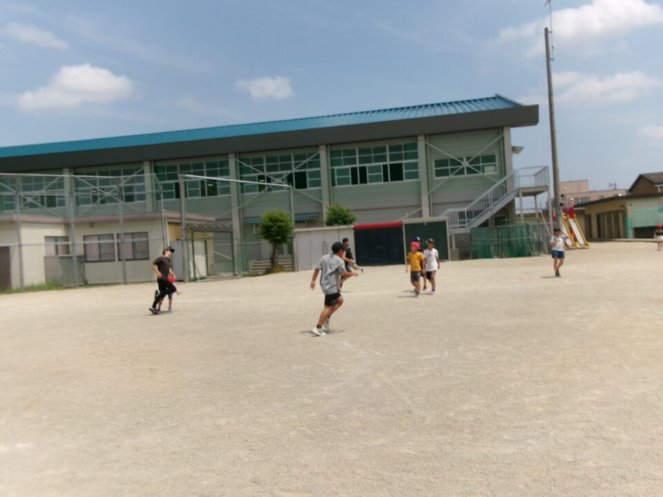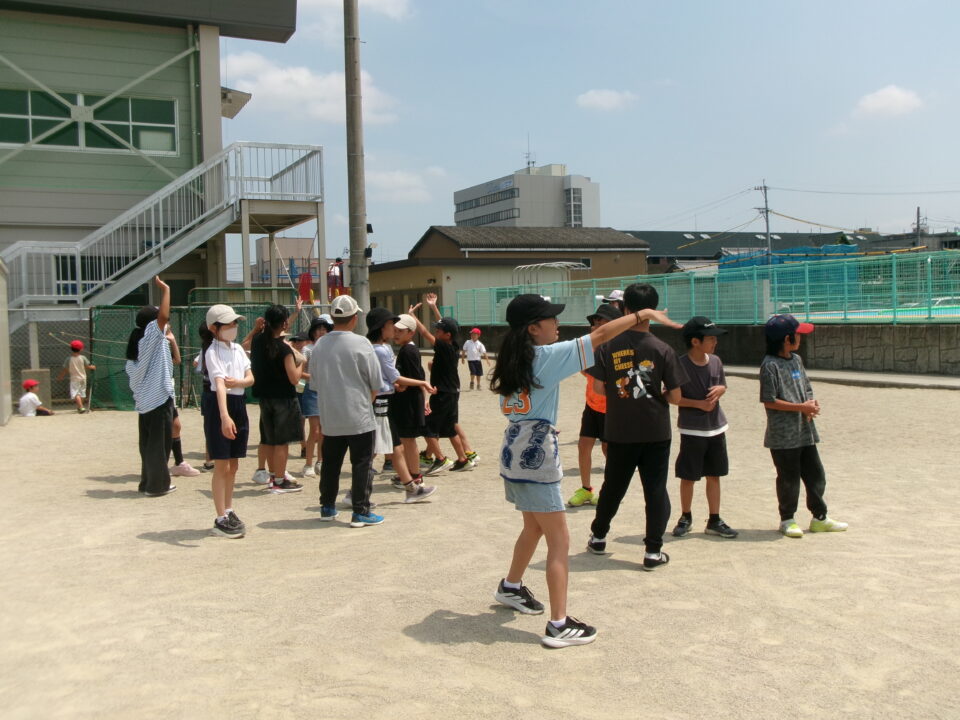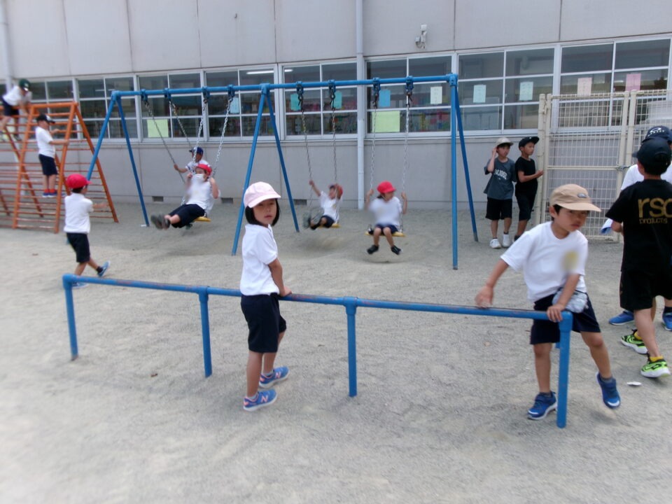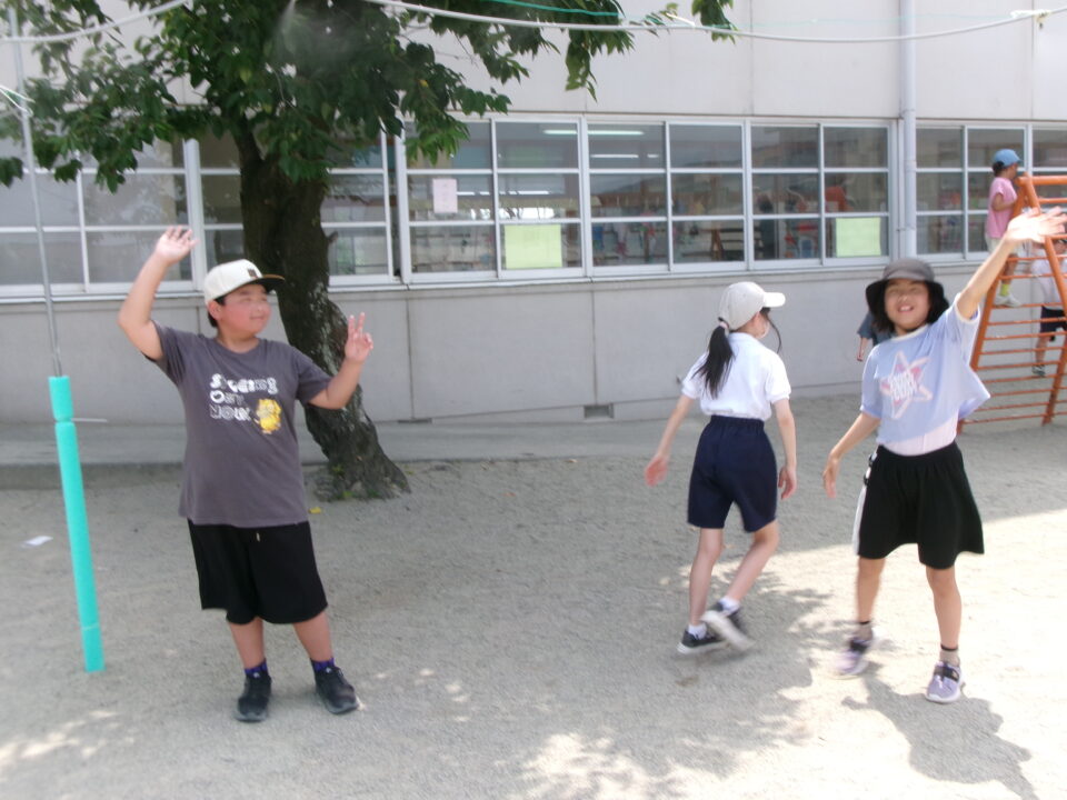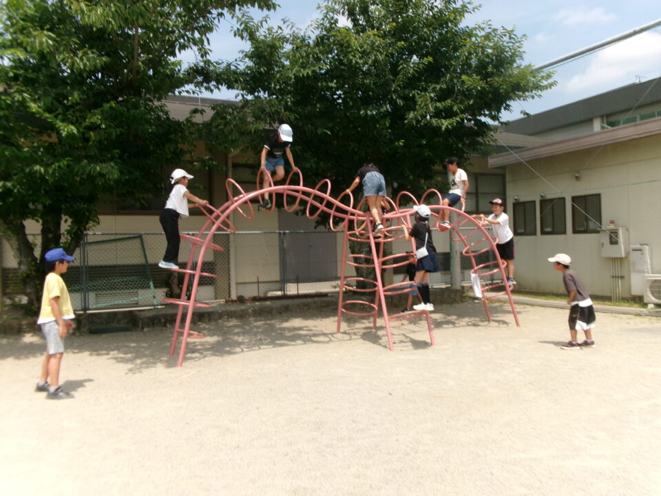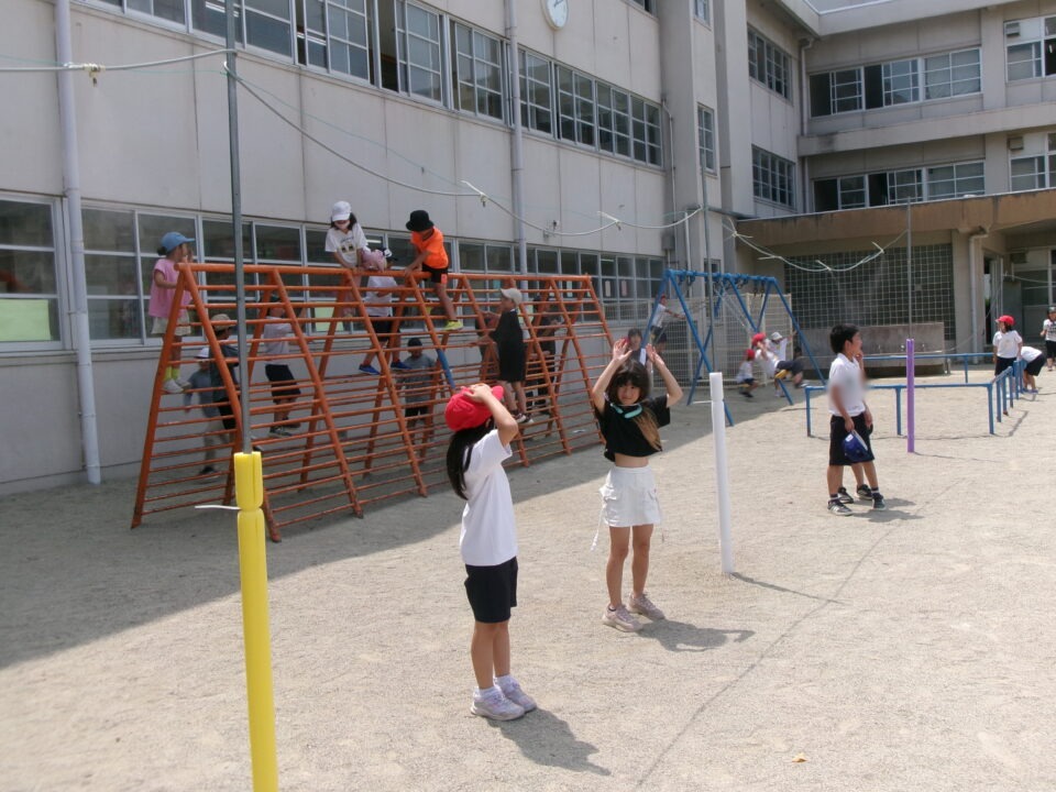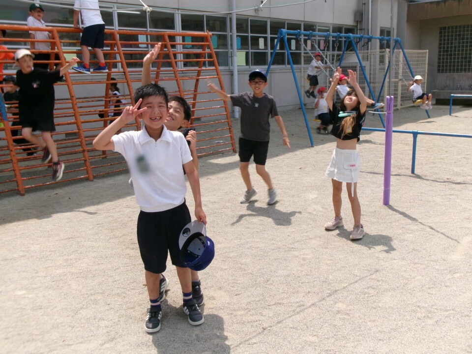 子どもたちは、昼休みに帽子をかぶって運動場へたくさんの子が遊びに出ています。