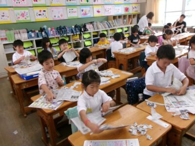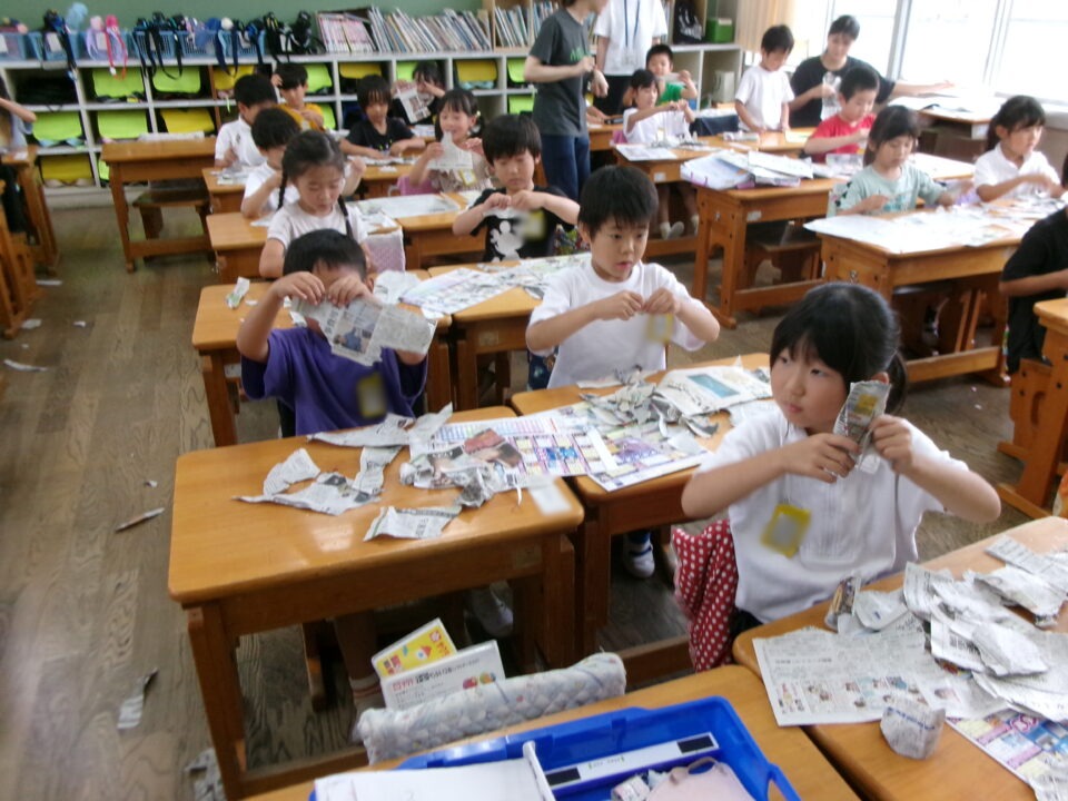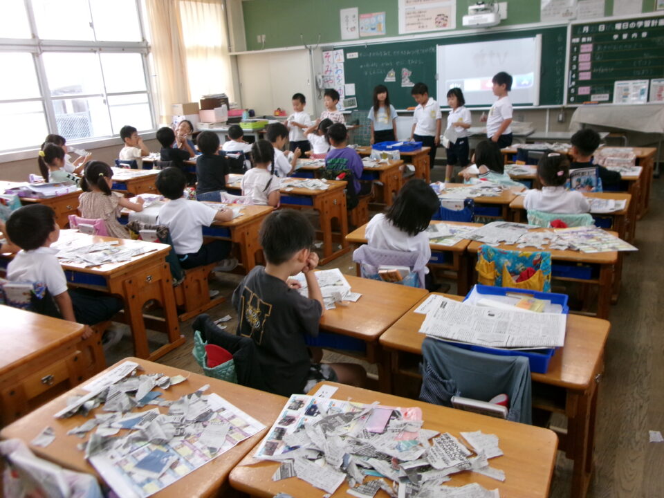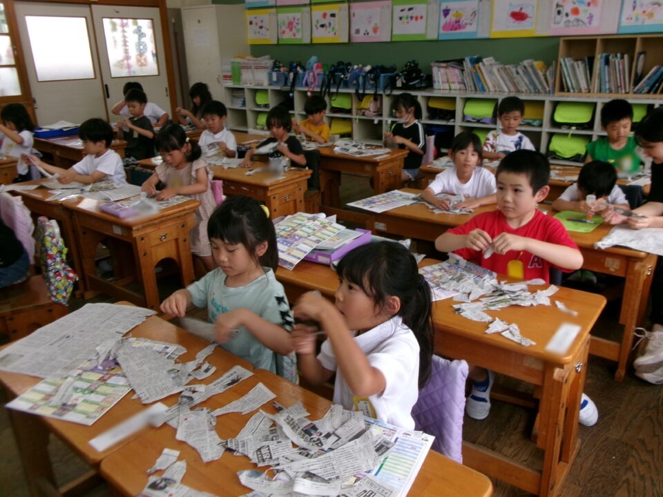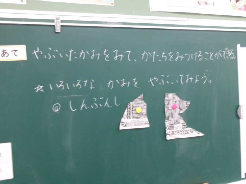 図工では、新聞紙を好きなようにびりびりに破ってできた形が何に見えるか説明します。