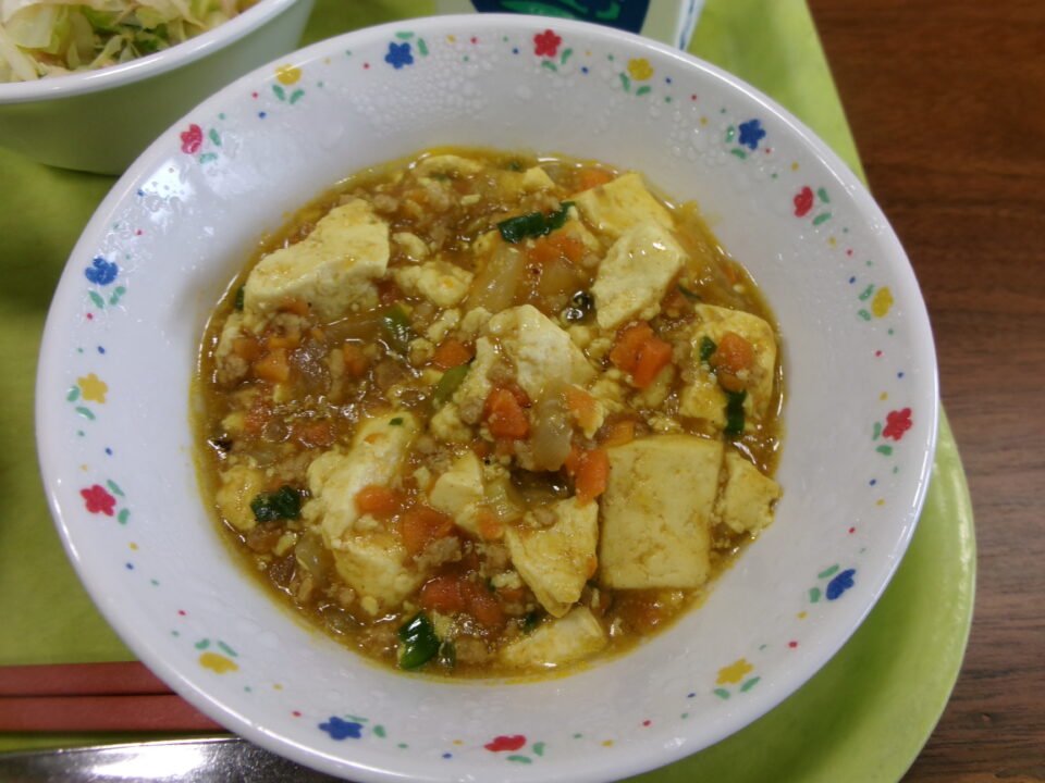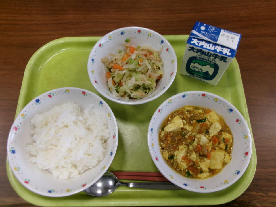 今日の給食は、ご飯、牛乳、カレーマーボー、中華風和え物でした。