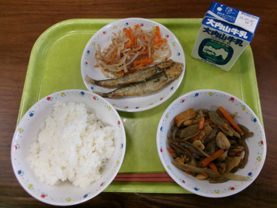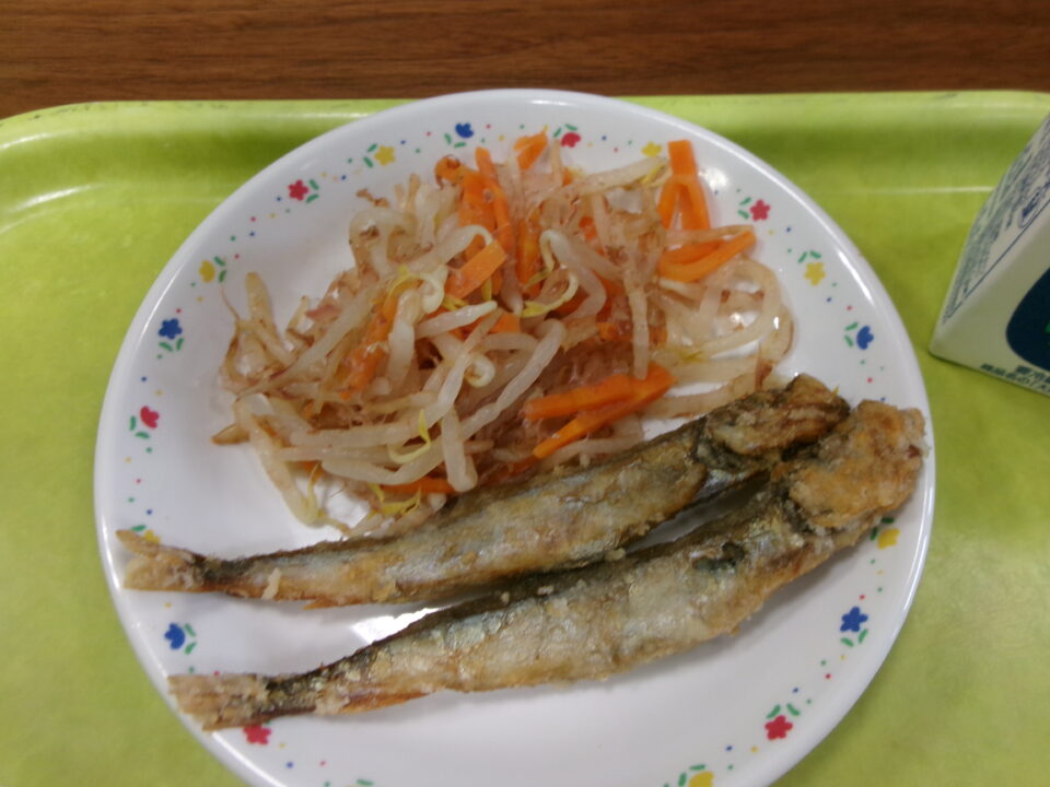 今日きょう給食きゅうしょくは、ごはん牛乳ぎゅうにゅう、ししゃものからげ、もやしのおかかえ、五目ごもくきんぴらでした。