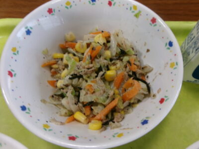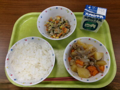 今日の給食は、ご飯、牛乳、新じゃがのうま煮、ひじきのごまドレサラダでした。