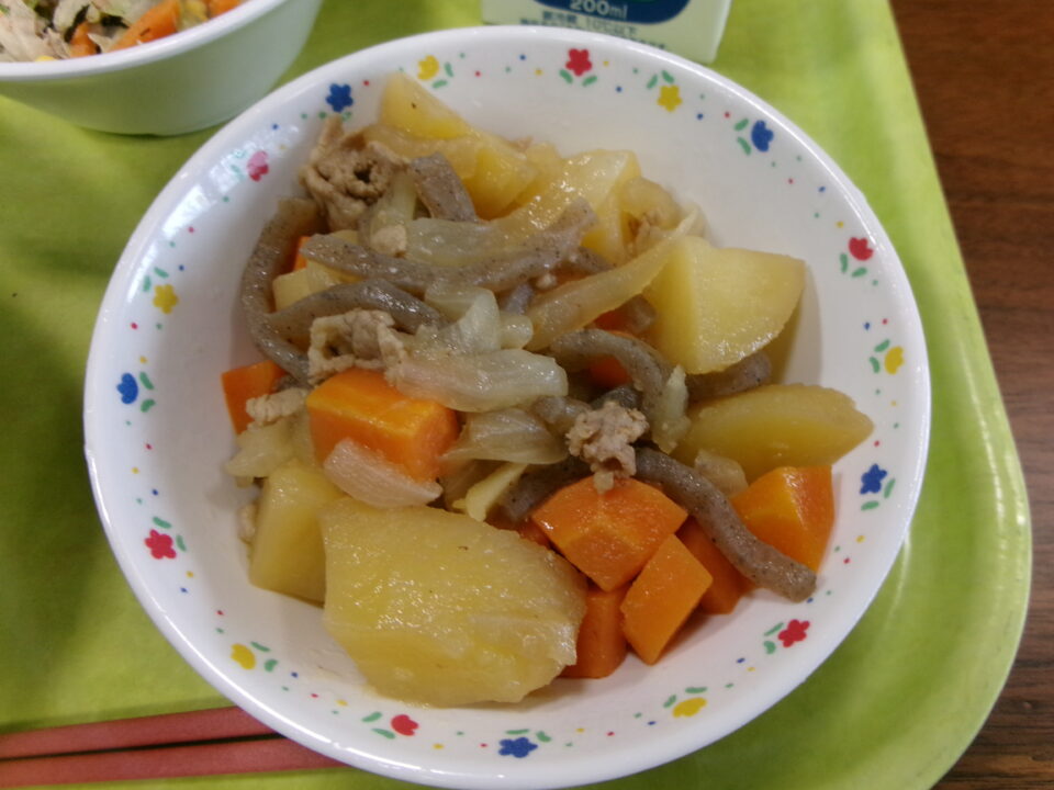 今日の給食は、ご飯、牛乳、新じゃがのうま煮、ひじきのごまドレサラダでした。