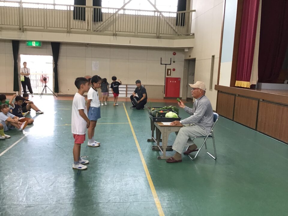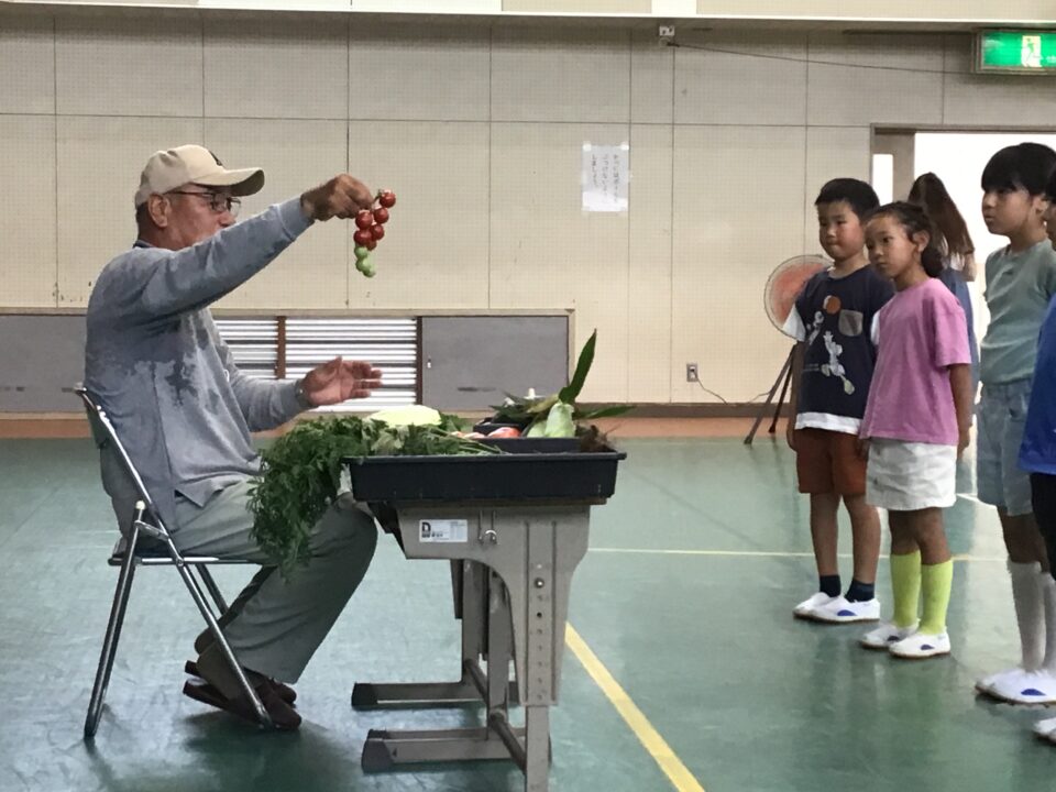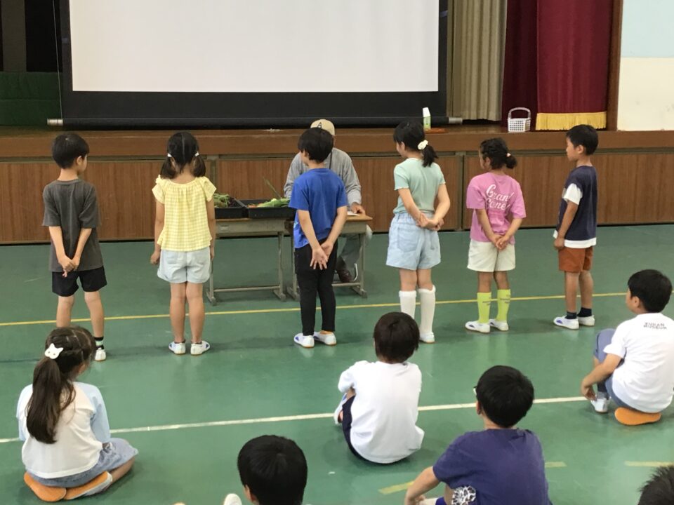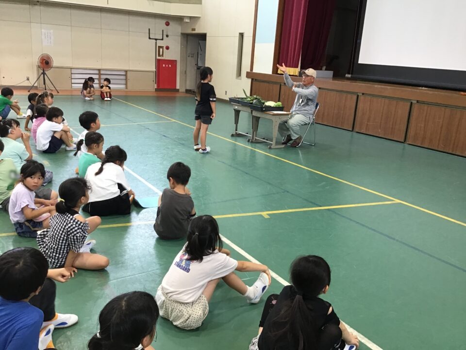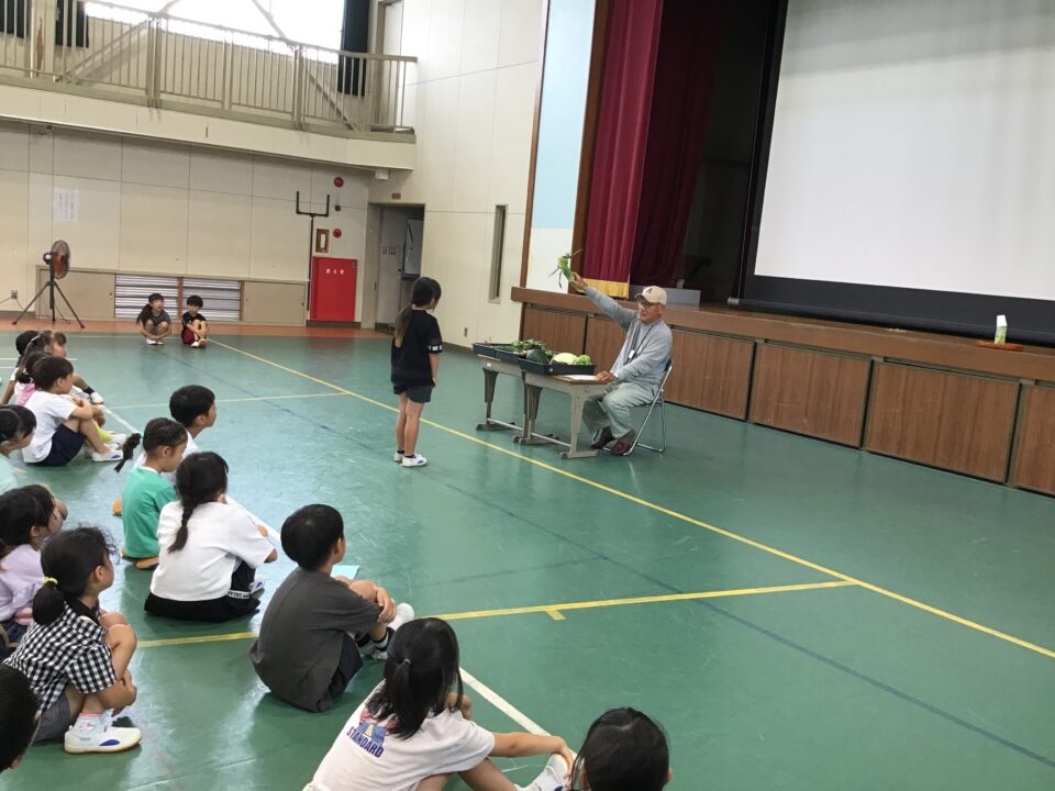 今日は、その一部の野菜を持ってきてくださり、子どもたちに見せてくれたり、子どもたちの質問に答えたりしてくれました。