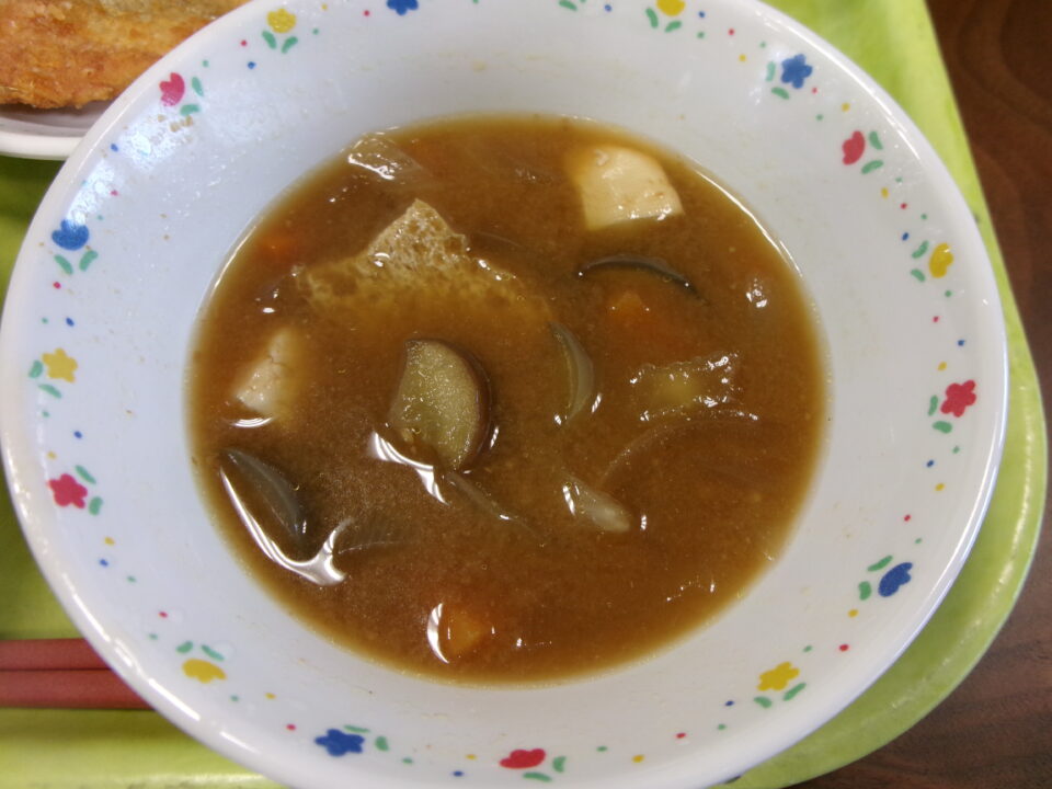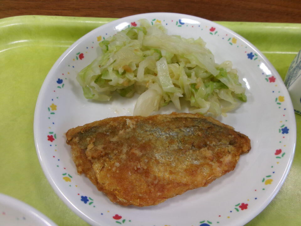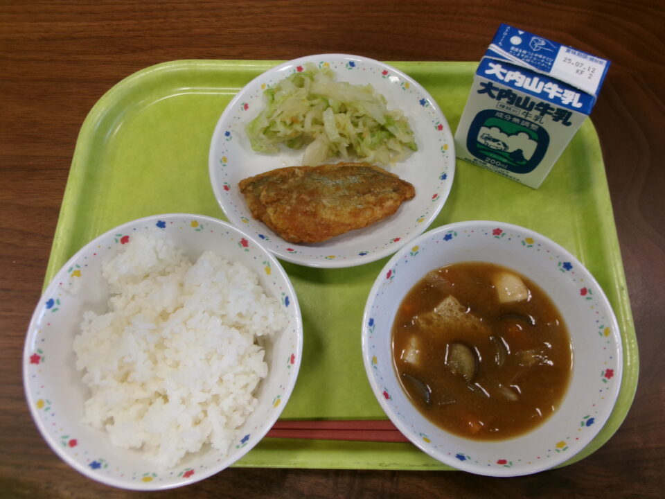 今日きょう給食きゅうしょくは、ごはん牛乳ぎゅうにゅう、あじの竜田揚たつたあげ、香味漬こうみづけ、なすのみそしるでした。