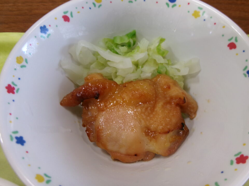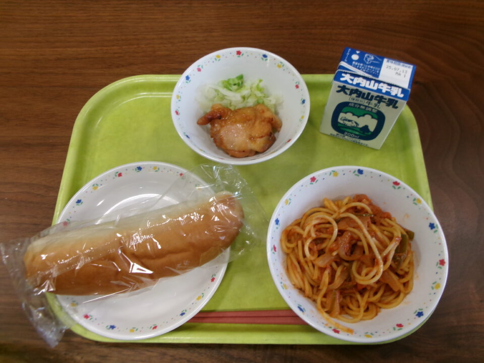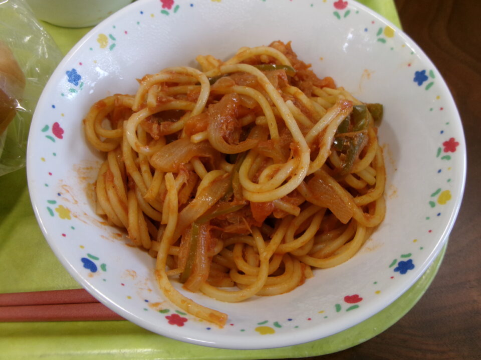 今日の給食は、小型コッペパン、牛乳、とり肉のマーマレード焼き、ゆでキャベツ、ツナと野菜のケチャップスパゲッティでした。