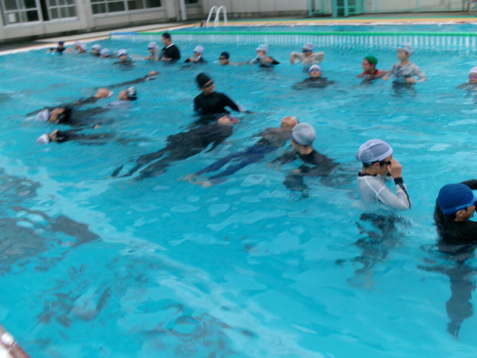 服を着て浮いて助けを待つ練習をしました。声を出し続けると肺にたまっていた空気が出ていき沈んでしまうそうです。体の中に空気を吸い込んで、肺にいっぱい空気をためておくと浮きやすくなります。