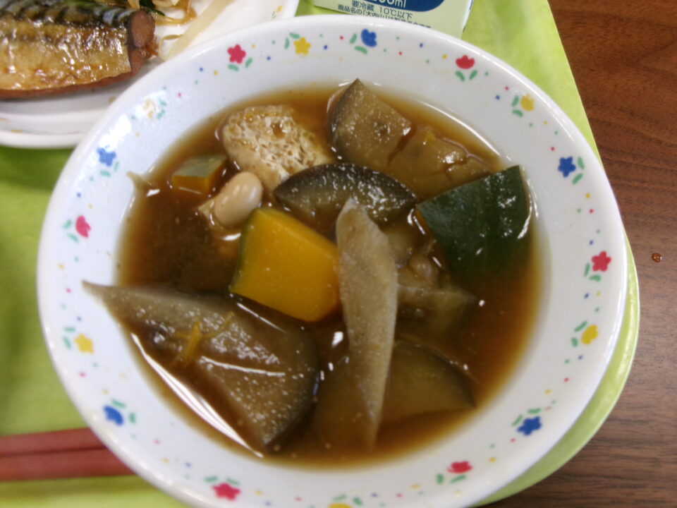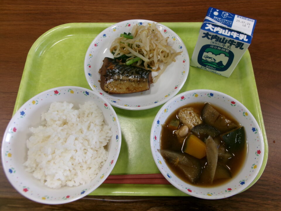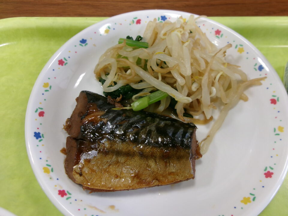 ご飯、牛乳、さばの煮付け、もやしと小松菜の和え物、盆汁でした。