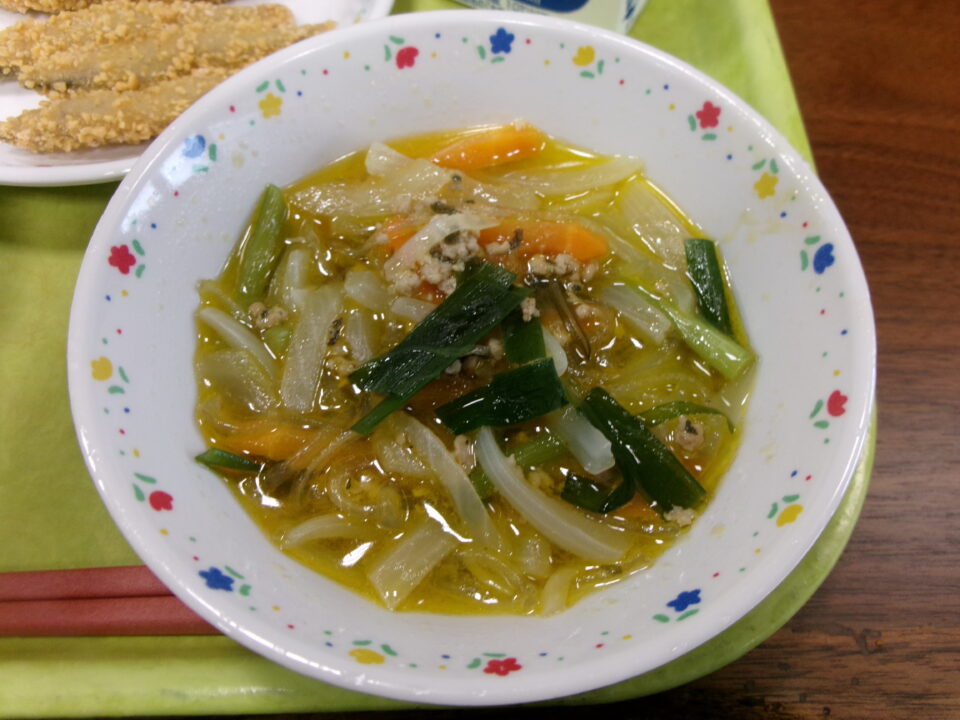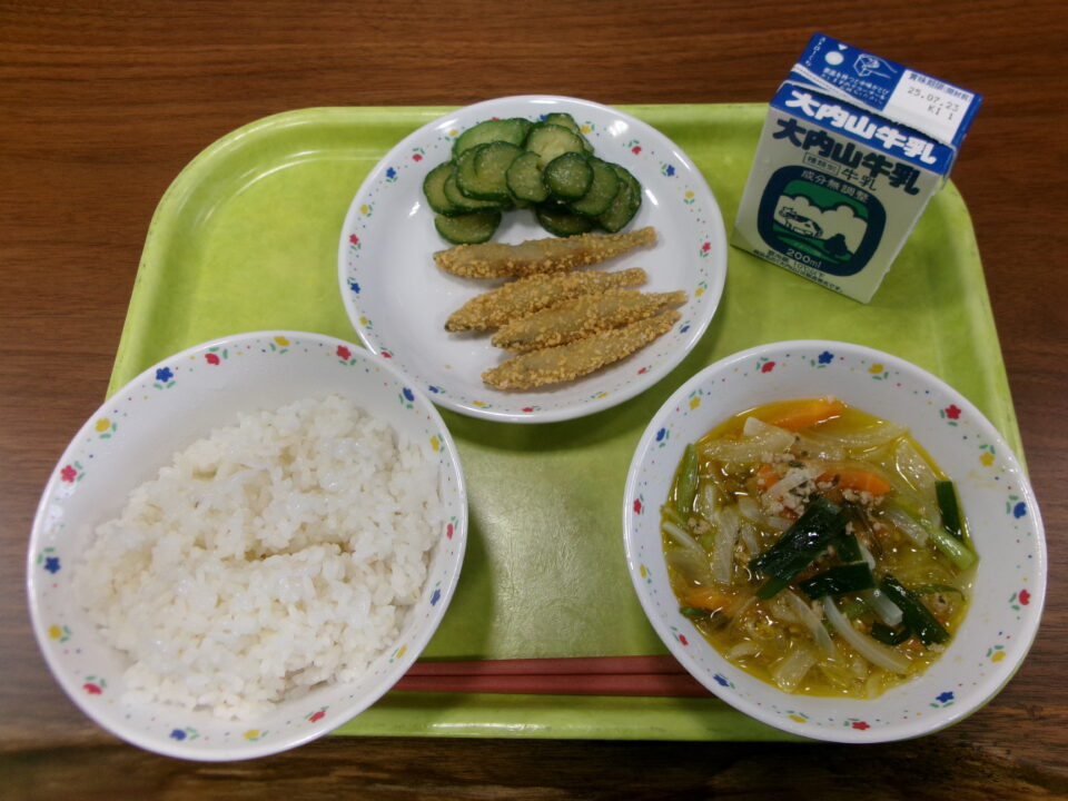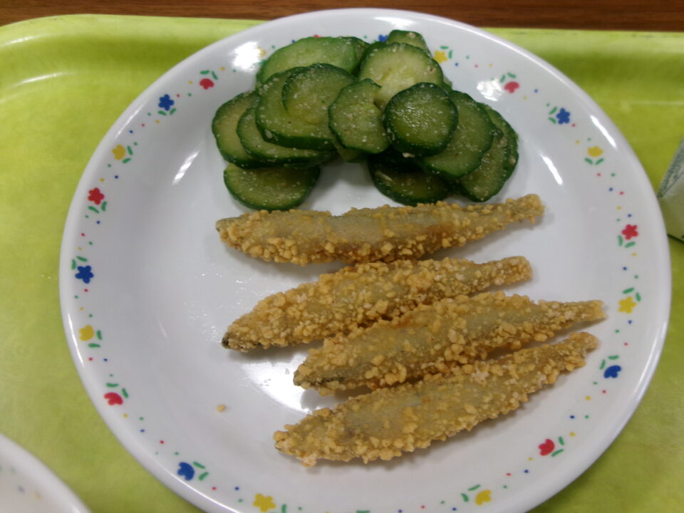 今日きょう給食きゅうしょくは、ごはん麦入むぎいり)、牛乳ぎゅうにゅう、きびなごのかりかりフライ、きゅうりの即席漬そくせきづけ、ケーン・チュート・ウンセンでした。