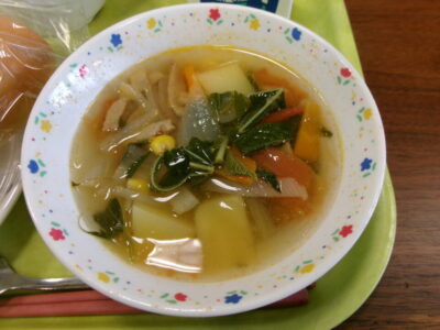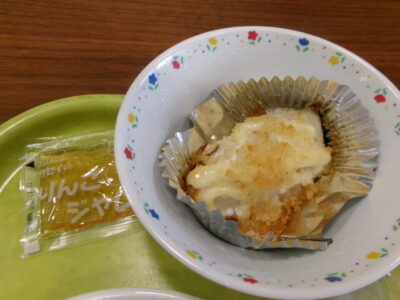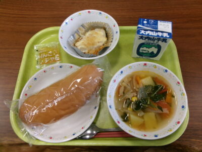今日の給食は、コッペパン、牛乳、さわらの米パン粉焼き、トマトとモロヘイヤのスープ、リンゴジャムでした。
