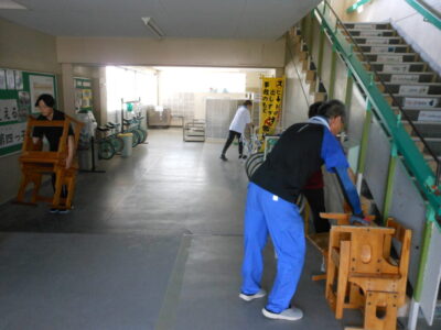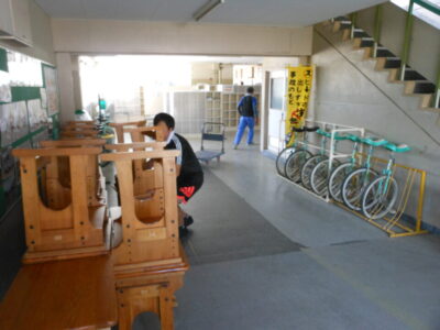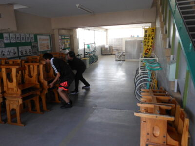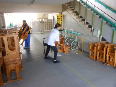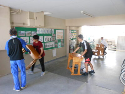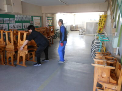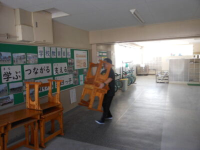 28日(月)に入れ替え作業のため、先生たちが1年生の机と椅子を昇降口まで運びました。