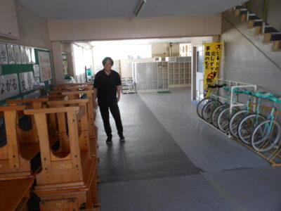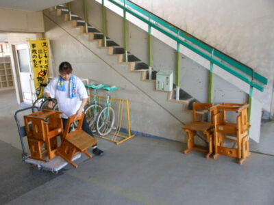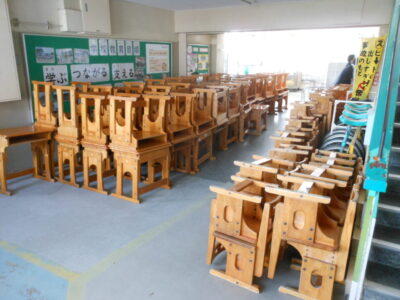 毎年、1年生用の軽い木製机と椅子が夏休みに届きます。
