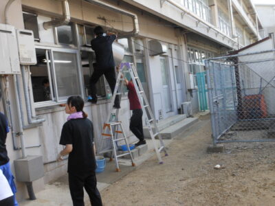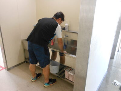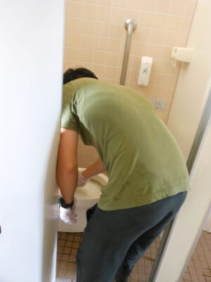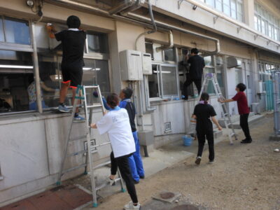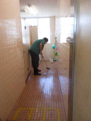 夏休みに入り、今日は先生たちで学校内の日頃の汚れを洗剤を使ってきれいに落としました。