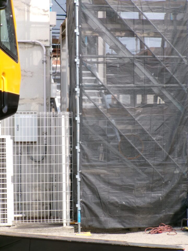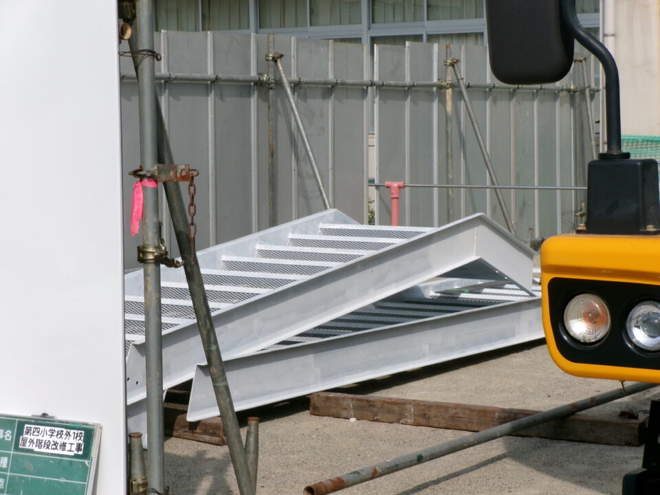 古い非常階段は外され、現在、新しいピカピカの非常階段を設置しています。