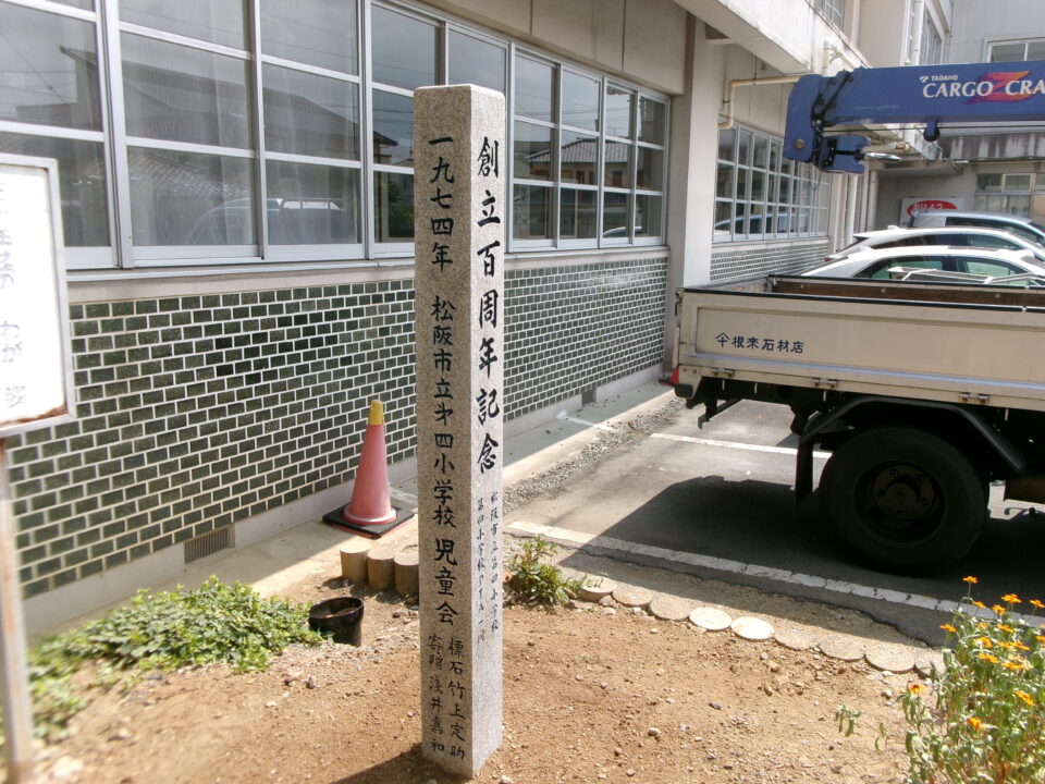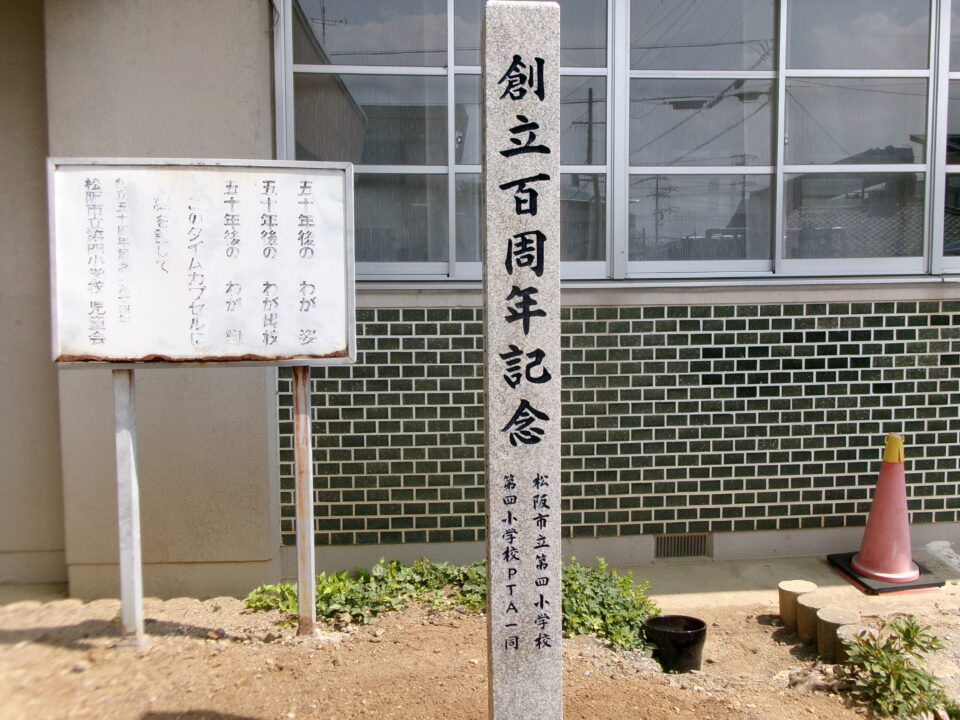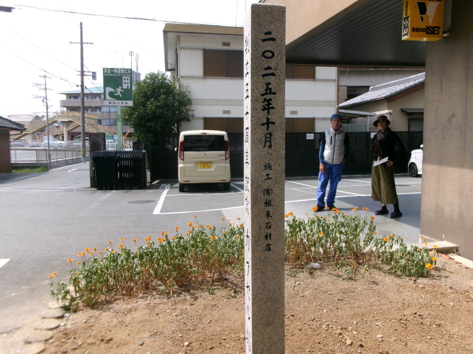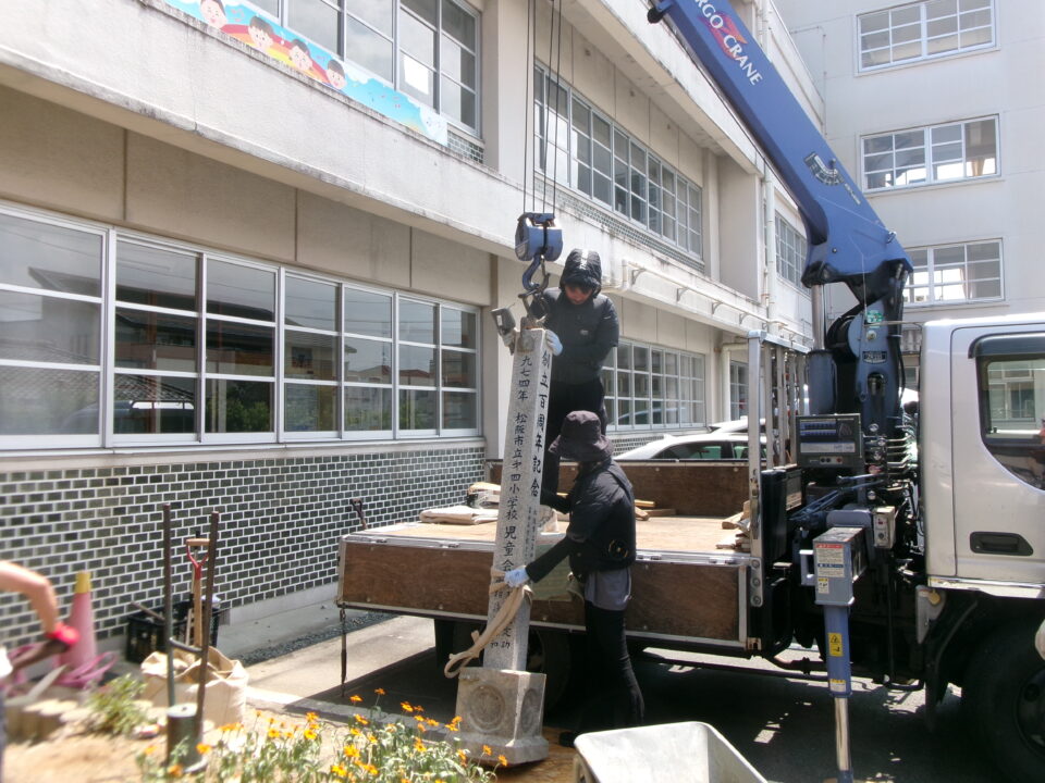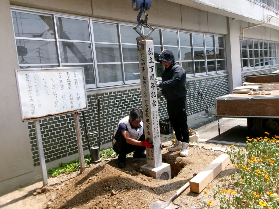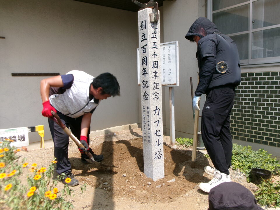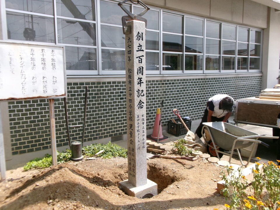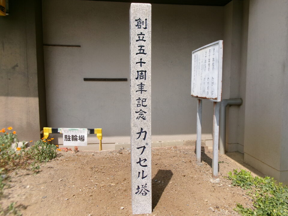 創立50周年の記念にタイムカプセルを埋めた際に建てられた石碑を創立100周年用にリニューアルしました。