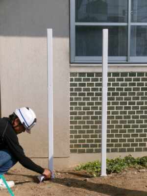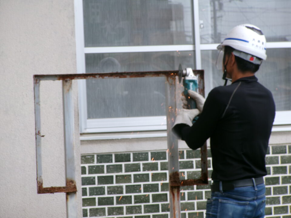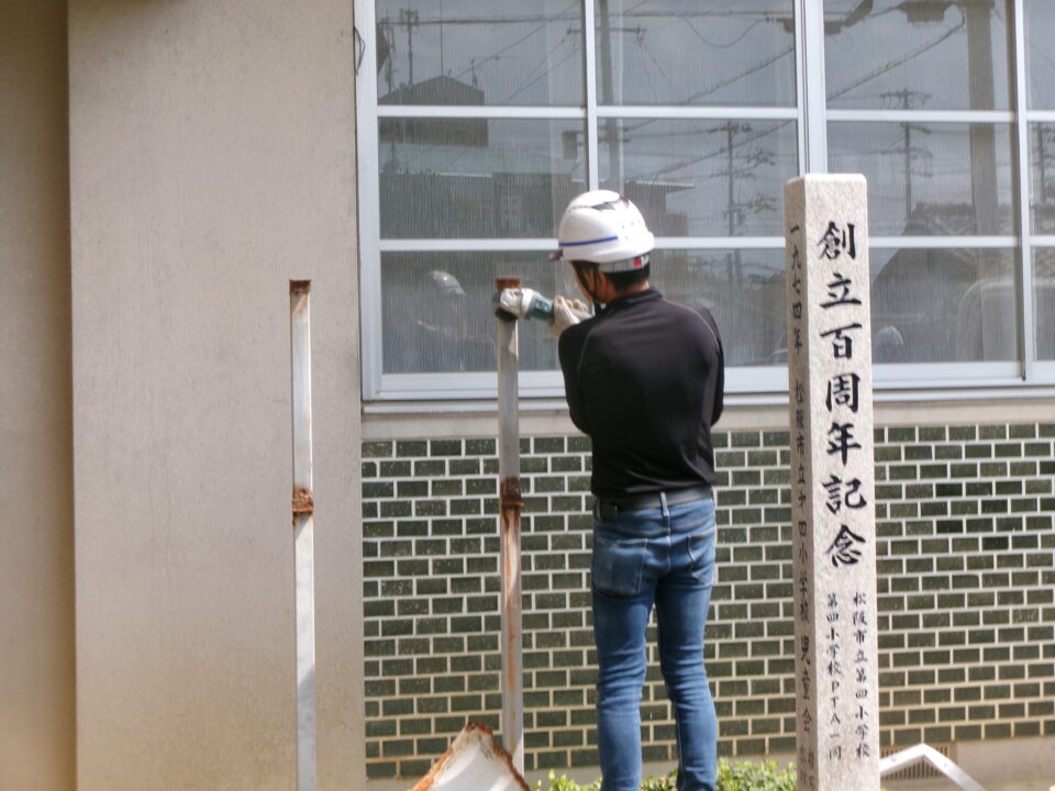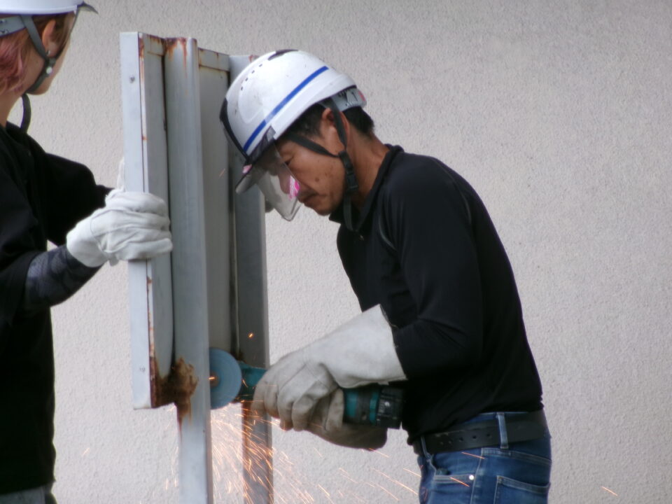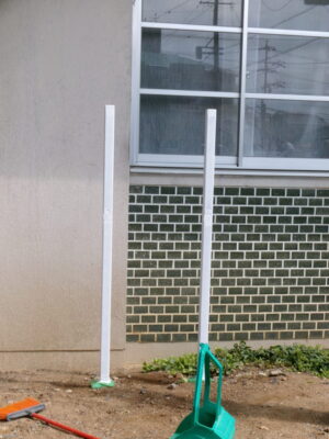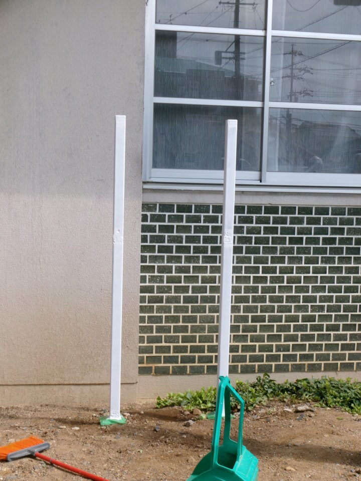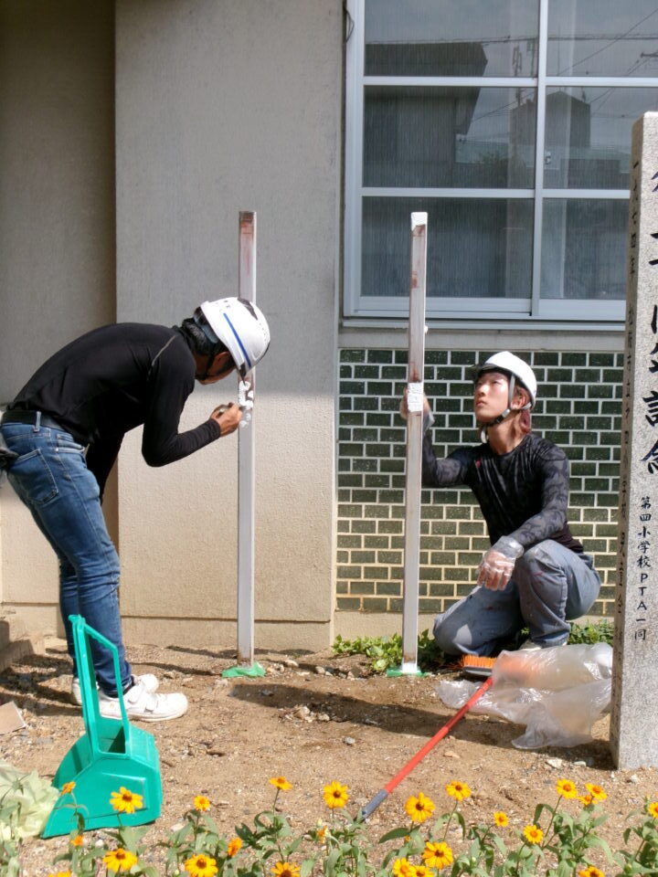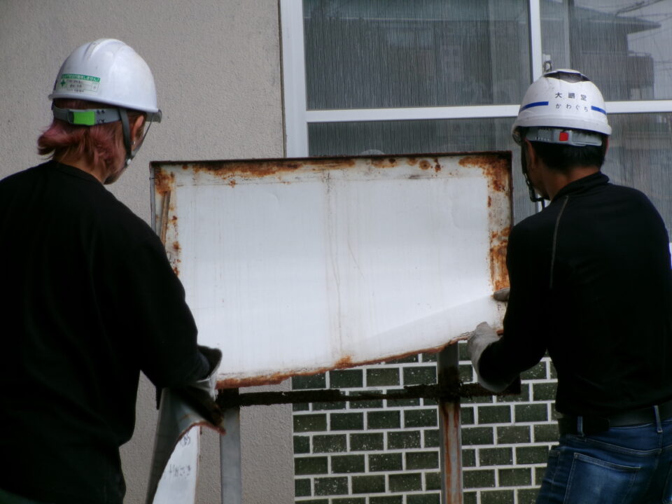 今日は、大鵬堂さんに古い看板を撤去していただき、脚も錆止めやペンキを塗り直していただきました。新しい看板ができあがってきたら、設置いたします。