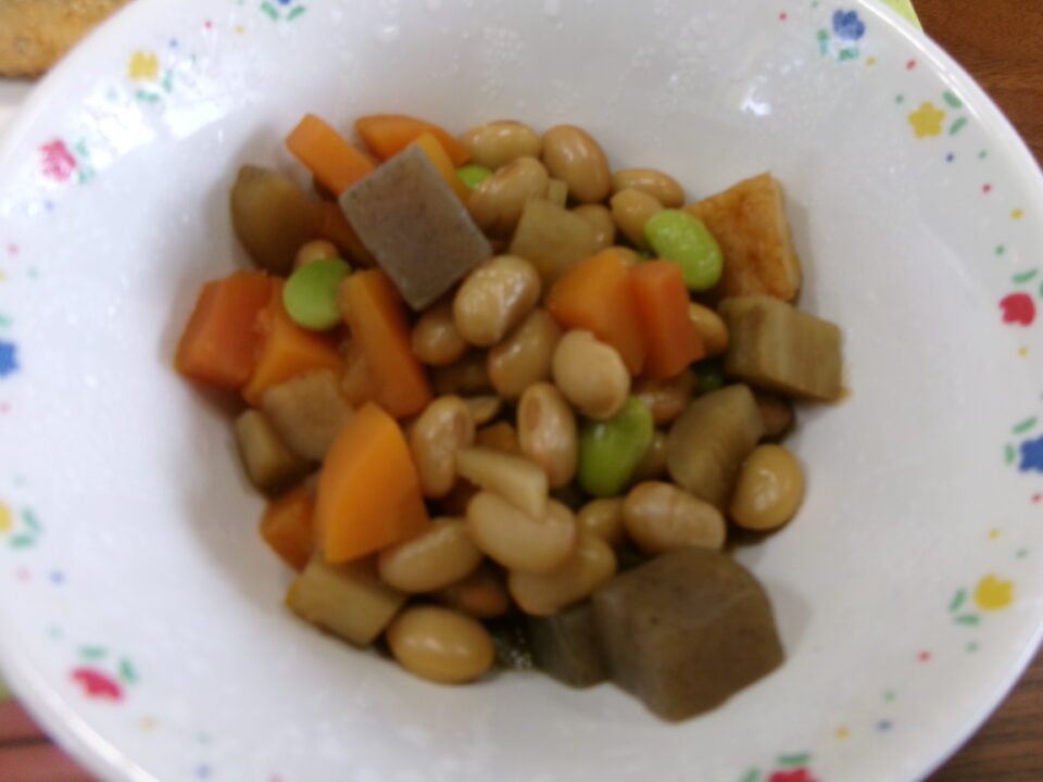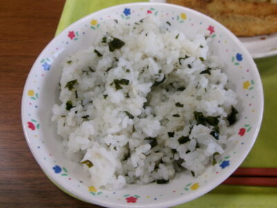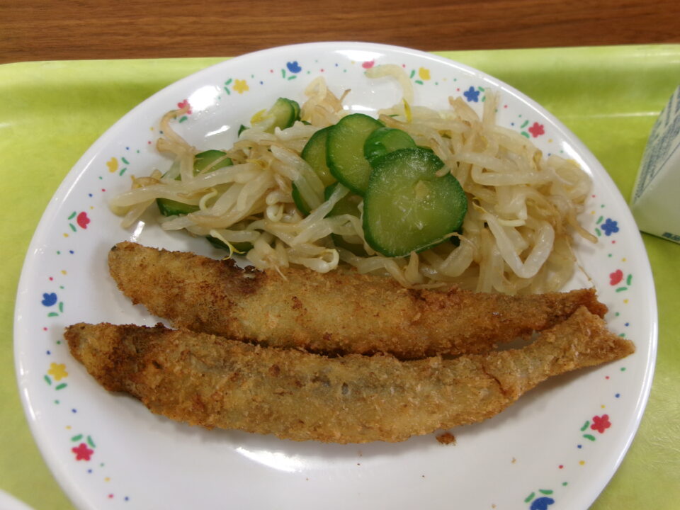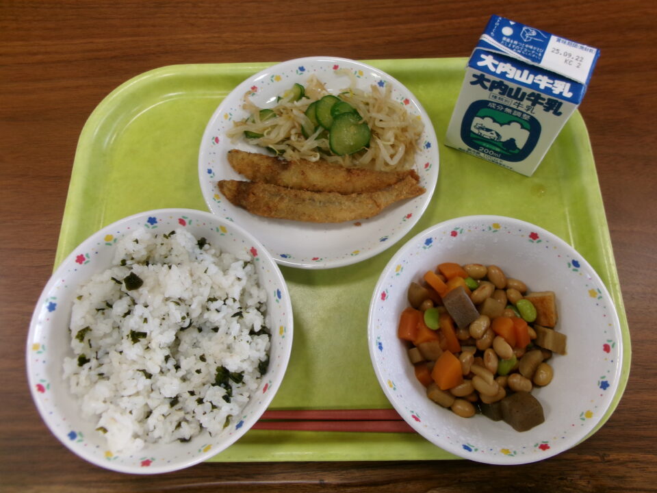今日の給食は、わかめご飯(麦入り)、牛乳、ししゃもフライ、香味漬け、いろどり煮豆でした。