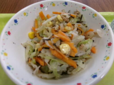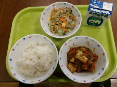 今日の給食は、ご飯(麦入り)、牛乳、厚揚げと豚肉のみそ炒め、ひじきサラダでした。