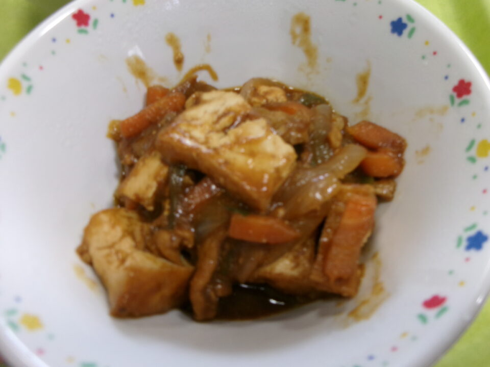 今日の給食は、ご飯(麦入り)、牛乳、厚揚げと豚肉のみそ炒め、ひじきサラダでした。