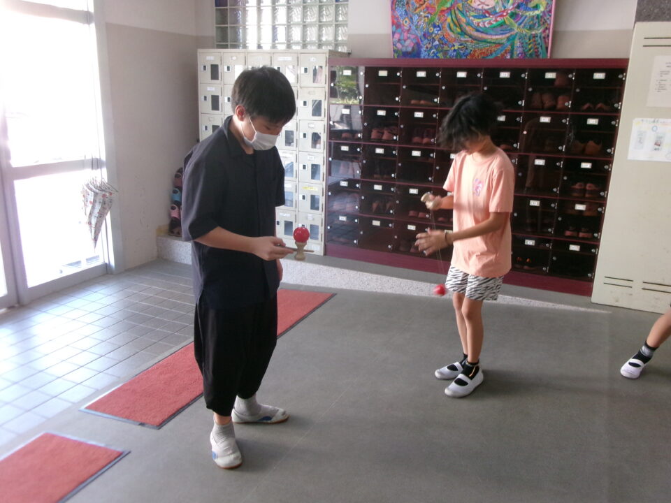 職員室前しょくいんしつまえ玄関げんかんには、どもたちがけんだま練習れんしゅうができるようにスペースをつくってあります。20分休ぷんやすみは、今日きょう一生懸命練習いっしょうけんめいれんしゅうする姿すがたがありました。最初さいしょは、うまくいかなくてもれてくるとコツがつかめますよ!がんばりましょう\(^o^)/