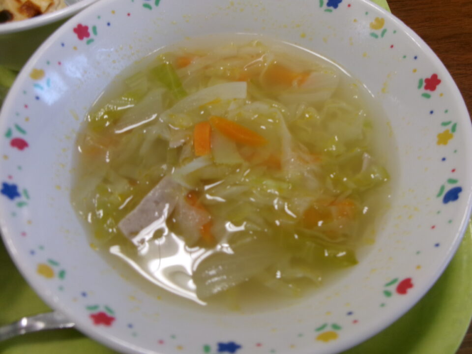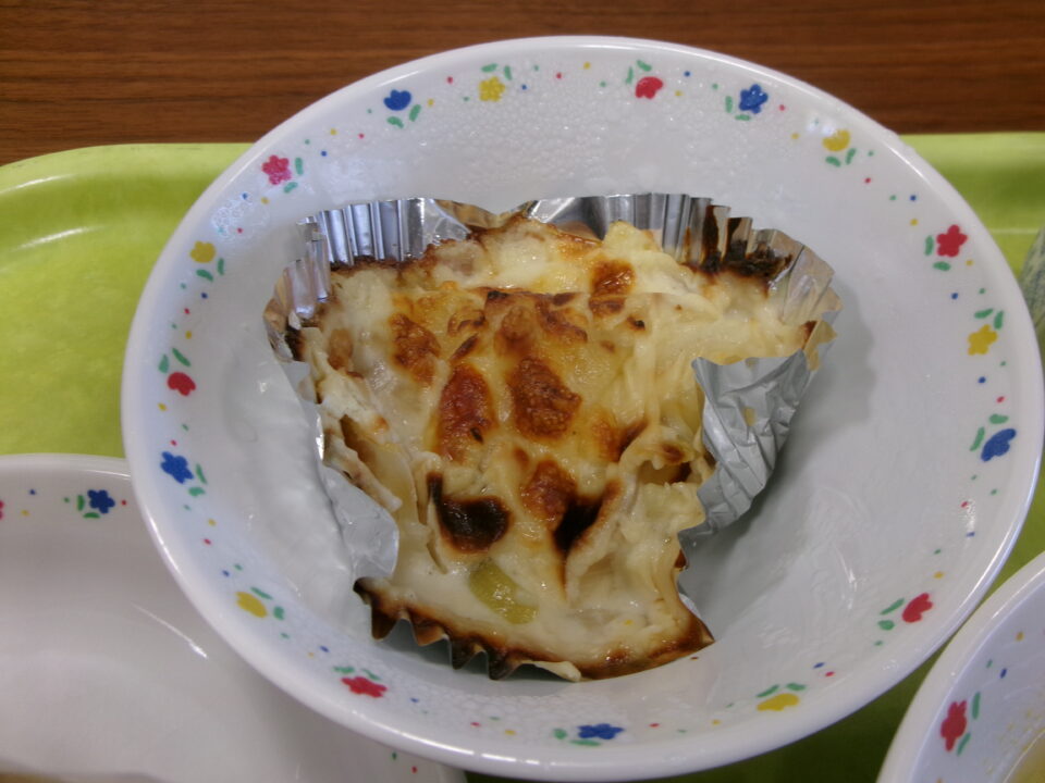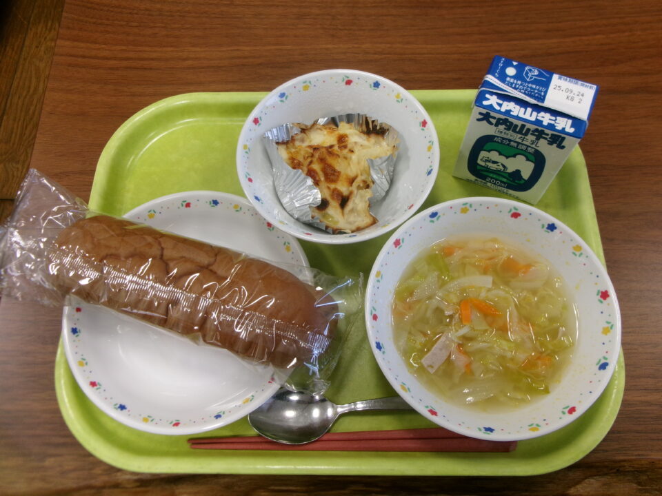 今日きょう給食きゅうしょくは、黒糖こくとうパン、牛乳ぎゅうにゅう、ポテトグラタン、ジュリアンスープでした。