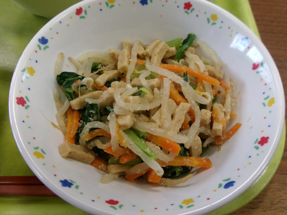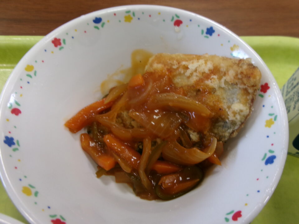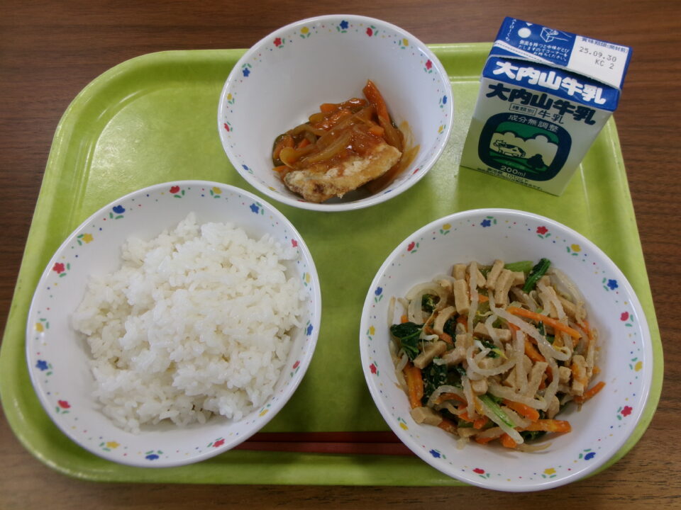 今日の給食は、ご飯、牛乳、さわらの甘酢あんかけ、高野豆腐のごま和えでした。