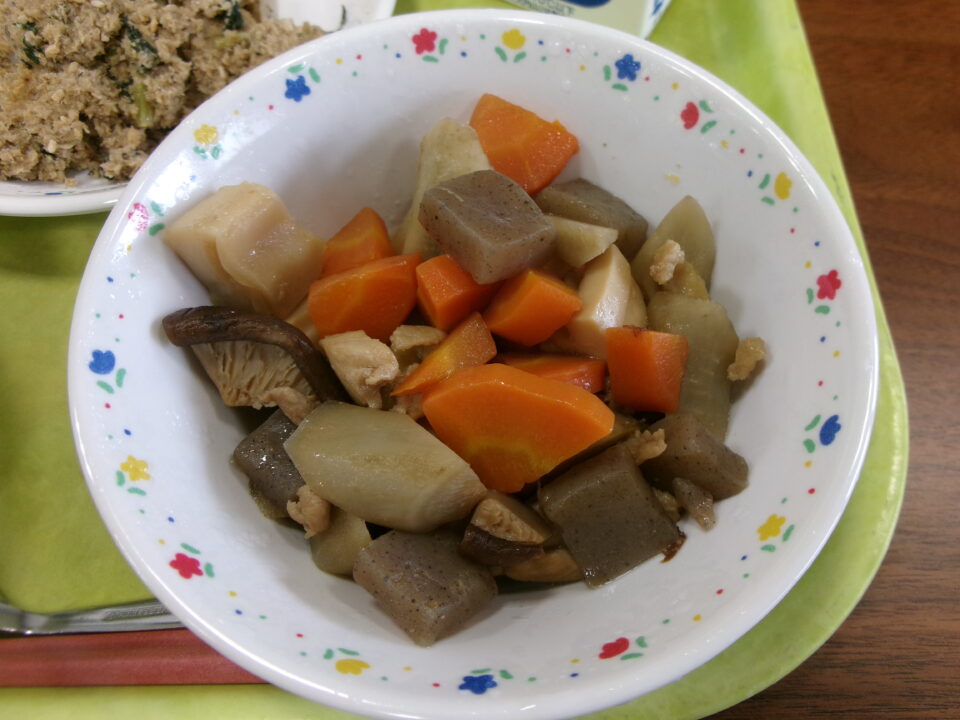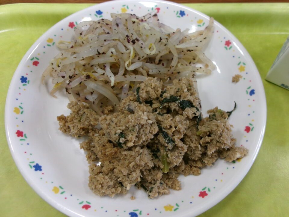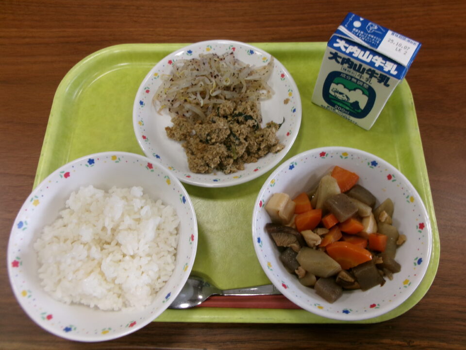 今日の給食は、ご飯、かんぱちそぼろ、牛乳、もやしのしそ和え、筑前煮でした。