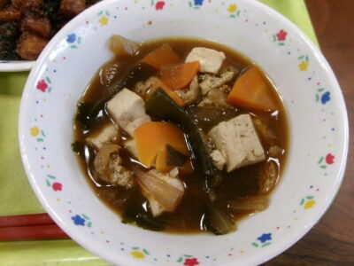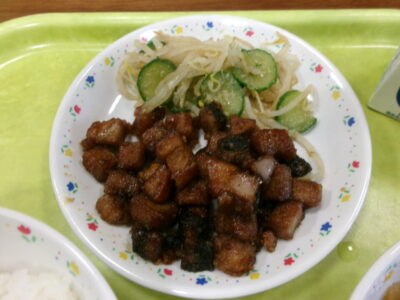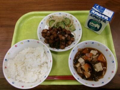 ご飯、牛乳、かつおの甘辛あげ、きゅうりのごま和え、なすのみそ汁でした。
