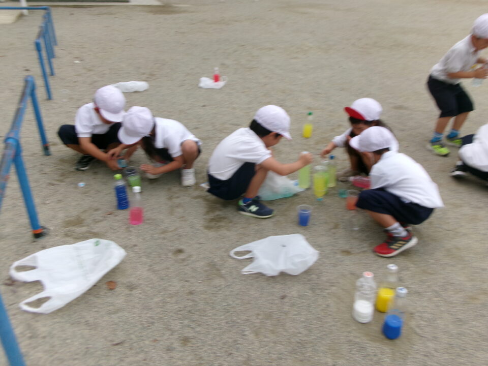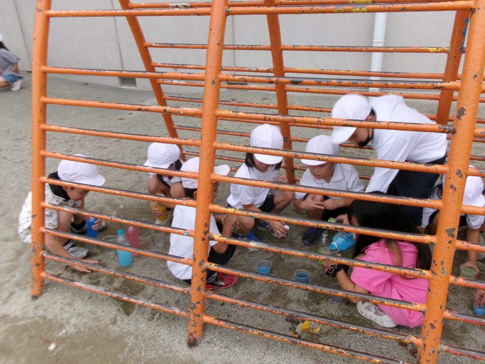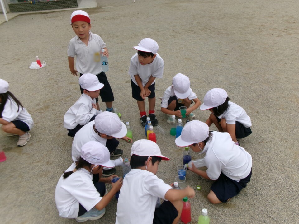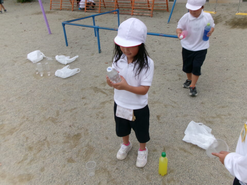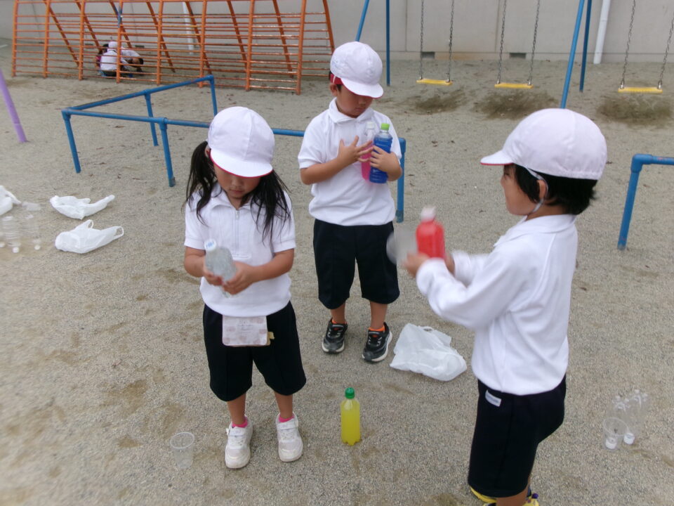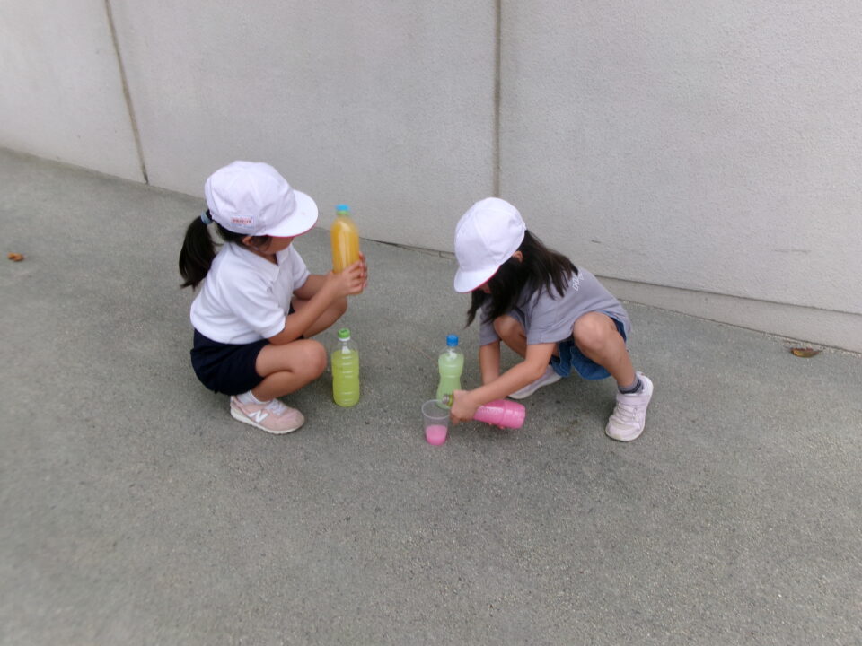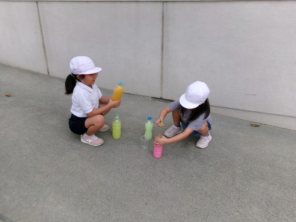 カラフルな色水づくりでは、ペットボトルに水を入れ、シャカシャカ振るときれいな色水に変わりました。
