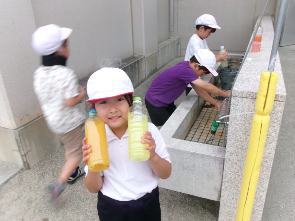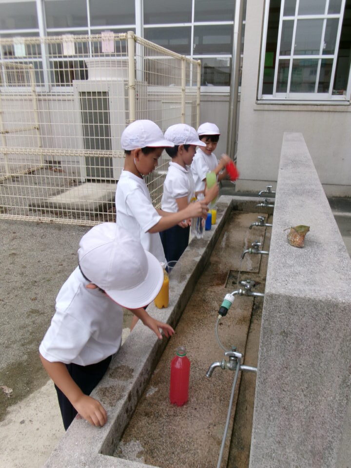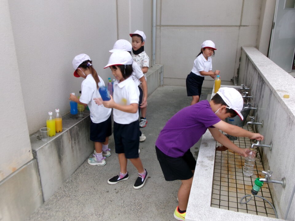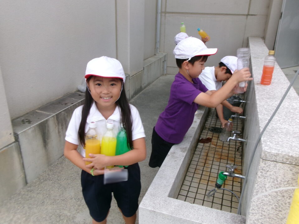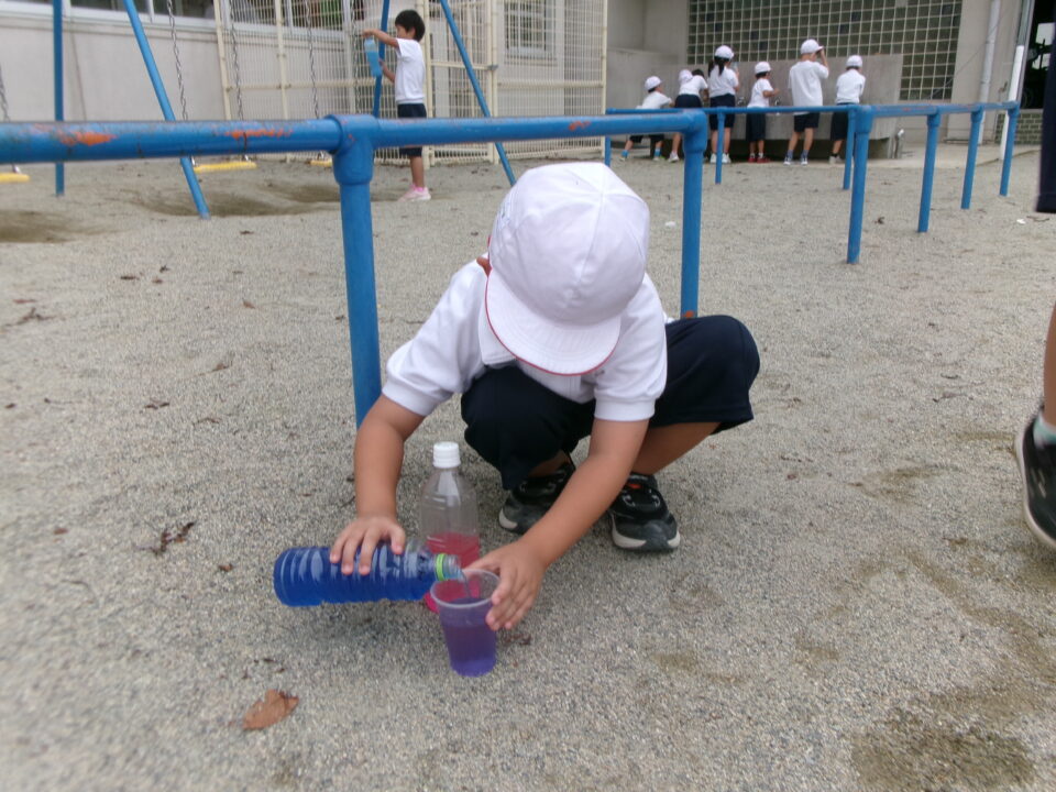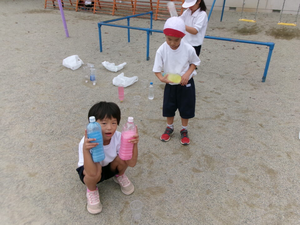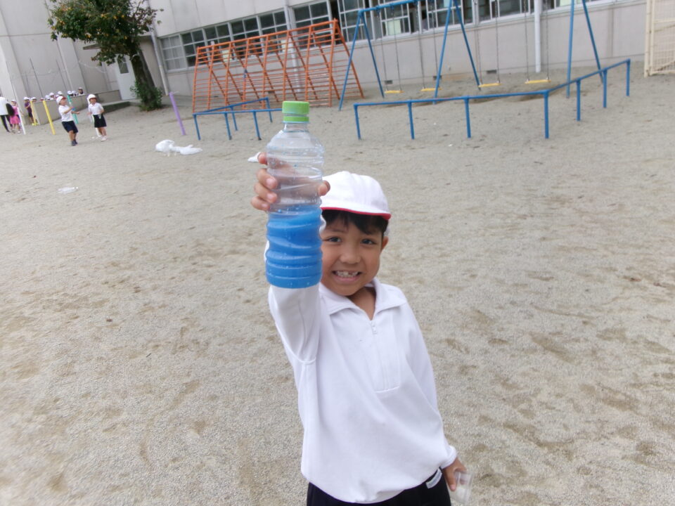カラフルな色水づくりでは、ペットボトルに水を入れ、シャカシャカ振るときれいな色水に変わりました。