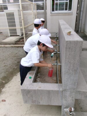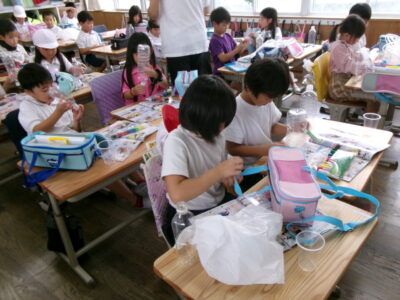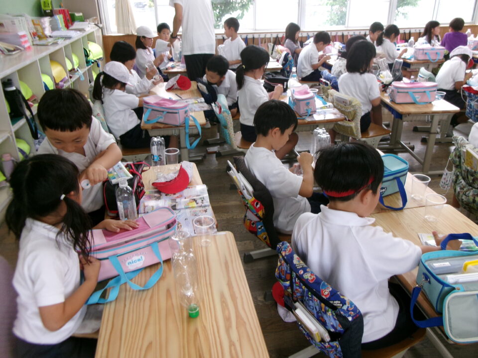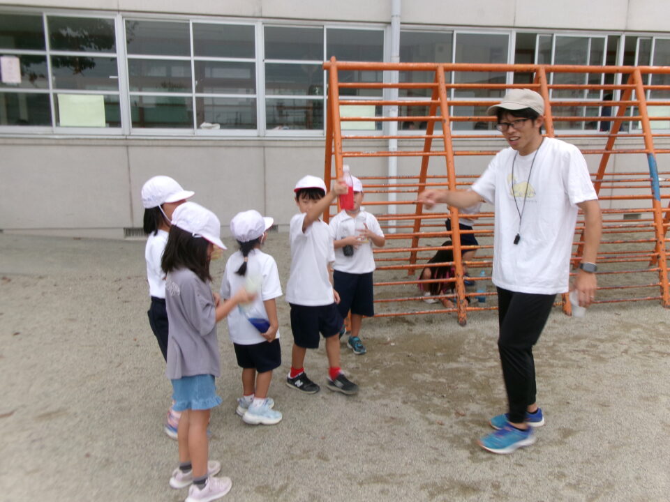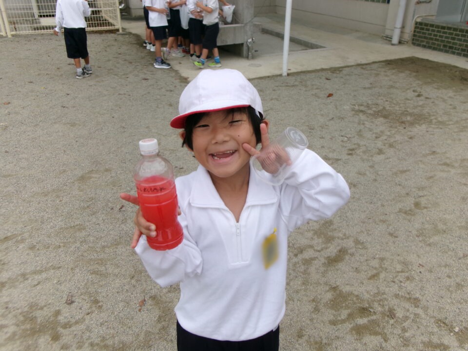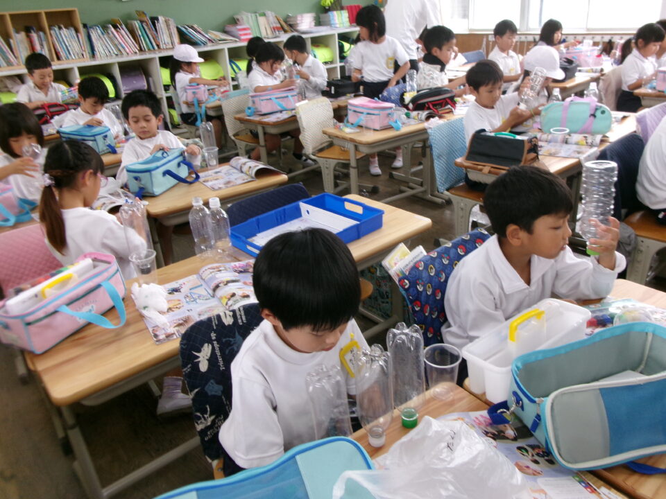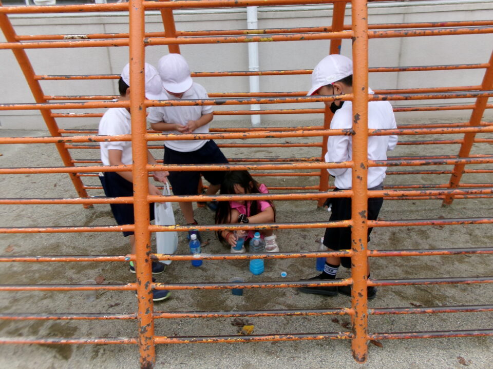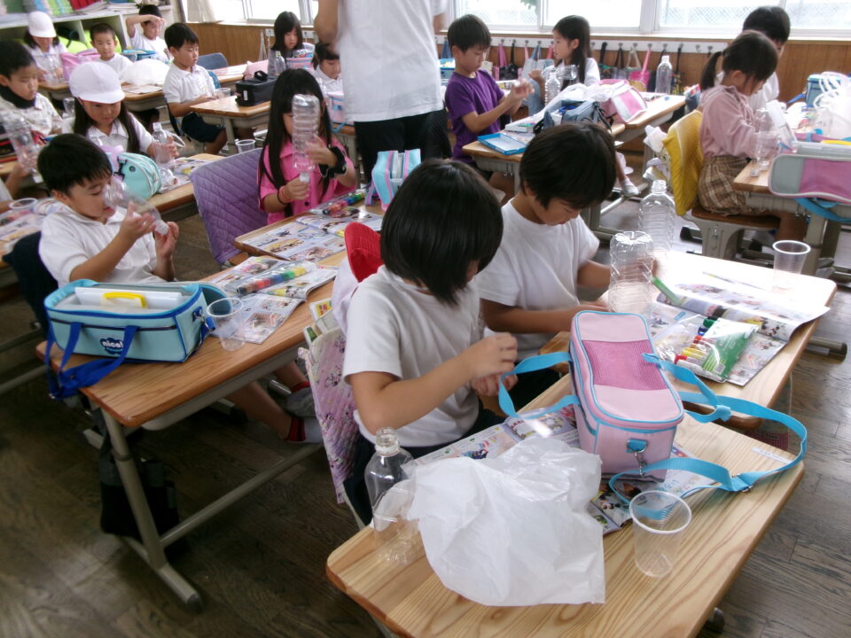 カラフルな色水づくりでは、ペットボトルに水を入れ、シャカシャカ振るときれいな色水に変わりました。