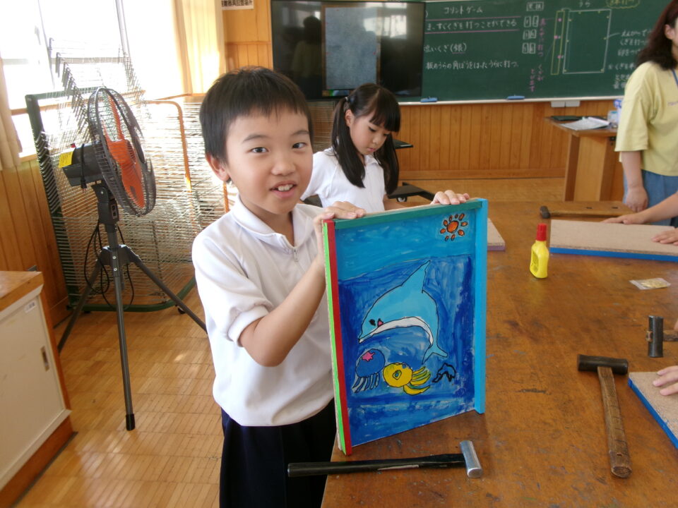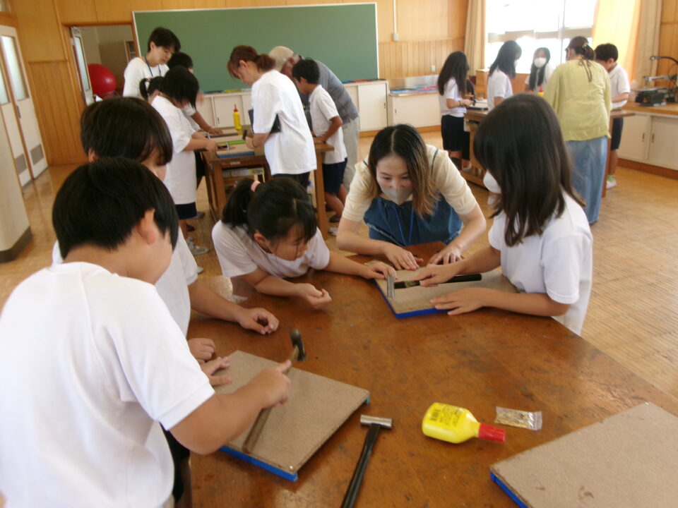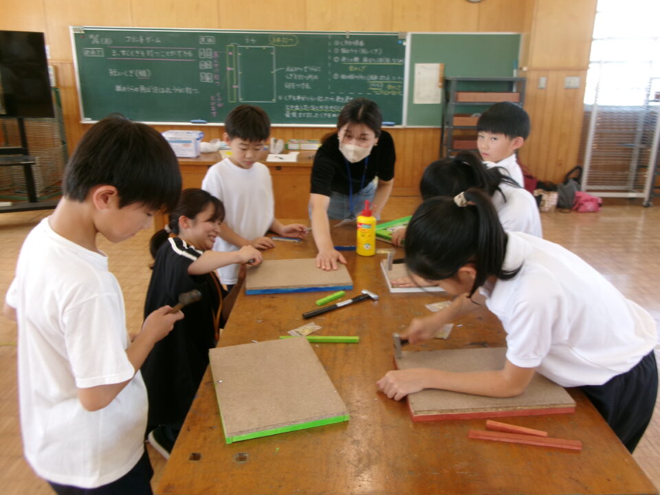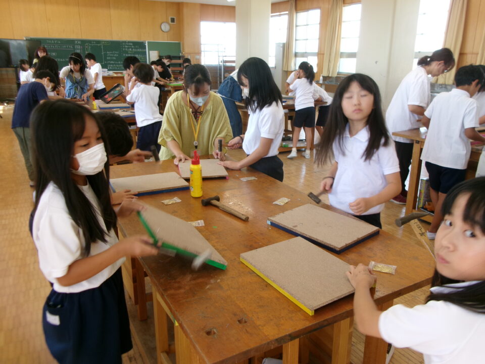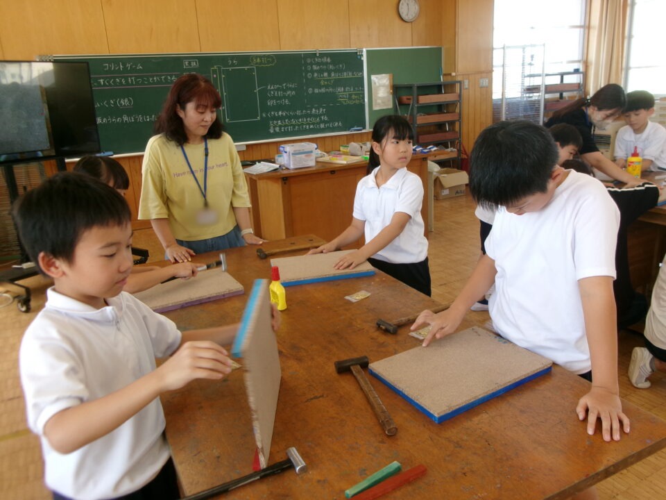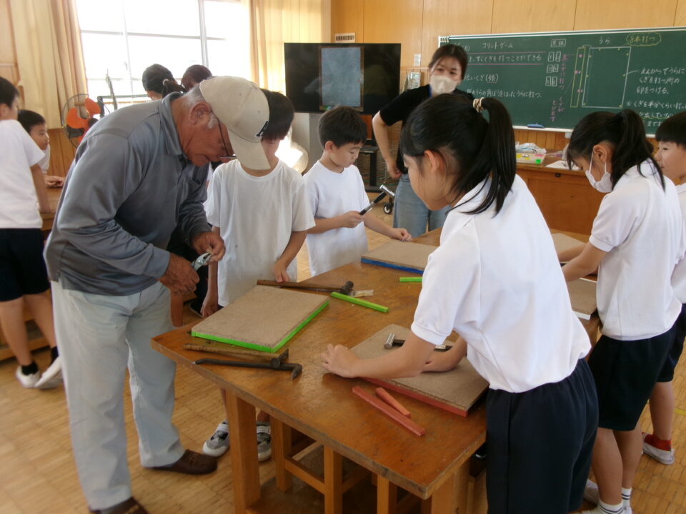 このコリントゲームは、金づちと釘をたくさん使いますので、子どもたちが間違って手を打ってしまう等、ケガをする心配があります。