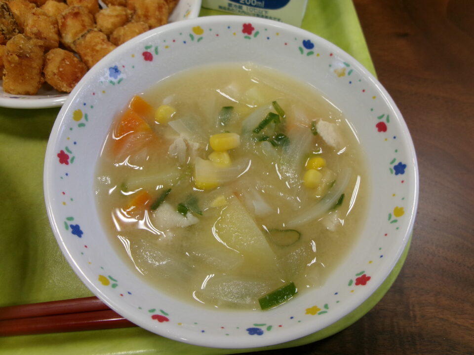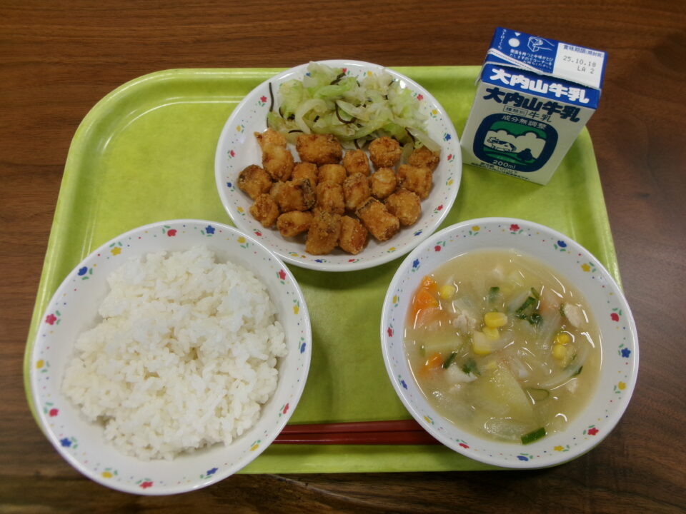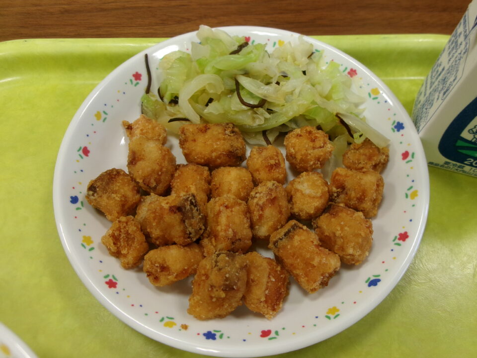 今日の給食は、ご飯、牛乳、さけのザンギ、キャベツの塩昆布和え、道産子汁でした。