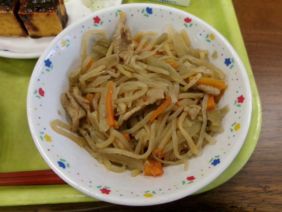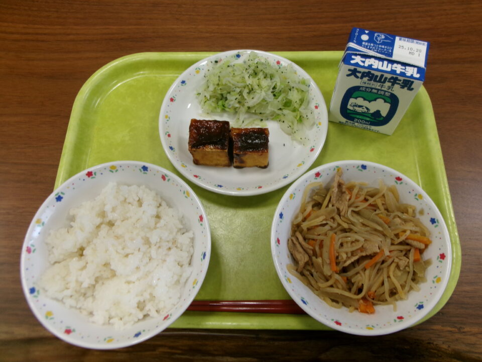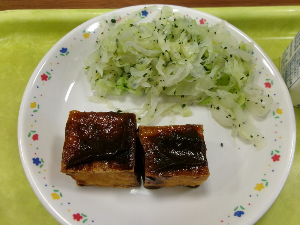 今日の給食は、ご飯(麦入り)、牛乳、厚揚げの田楽風、キャベツの青じそ和え、きんぴらごぼうでした。