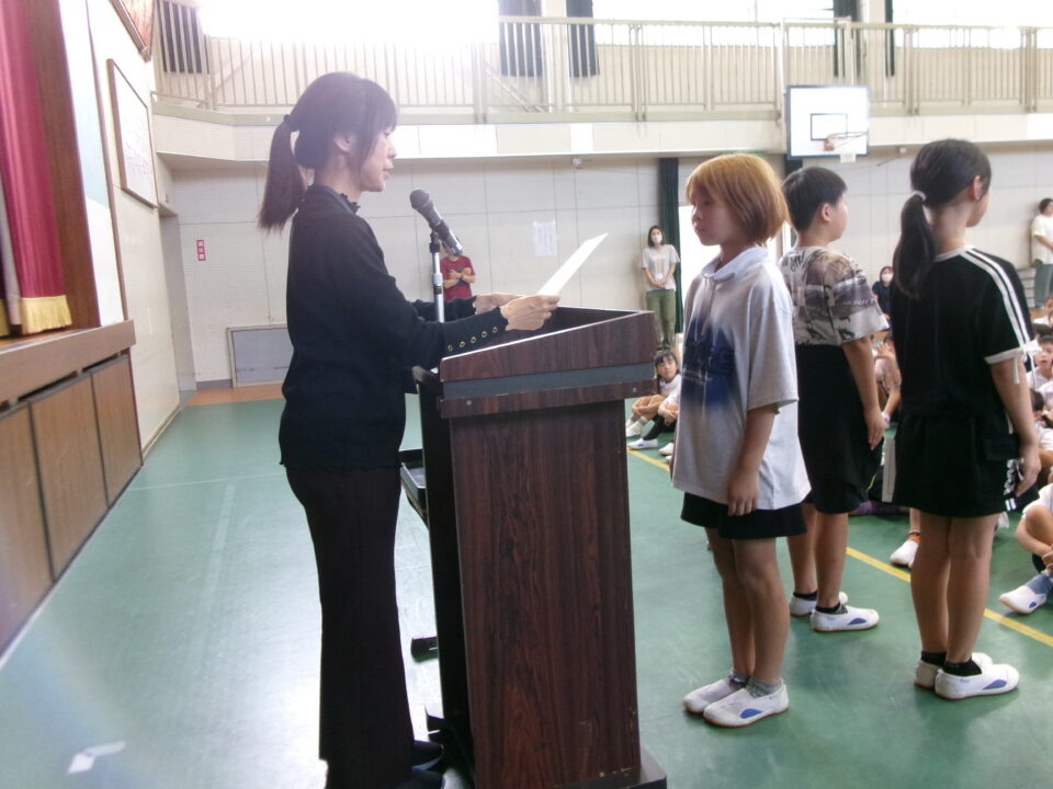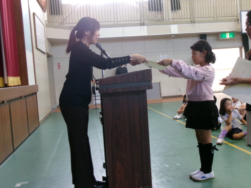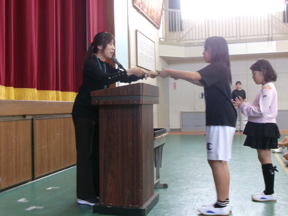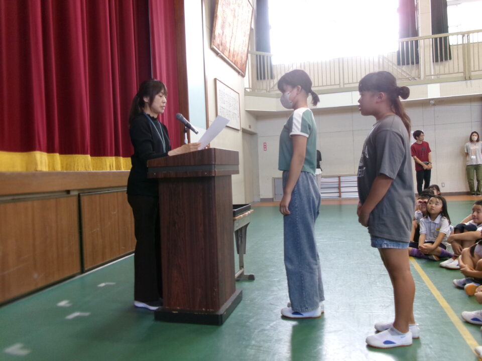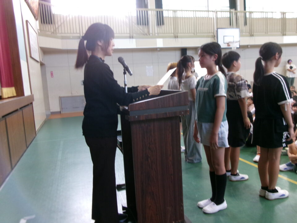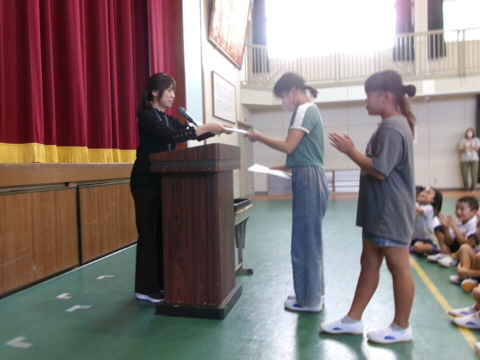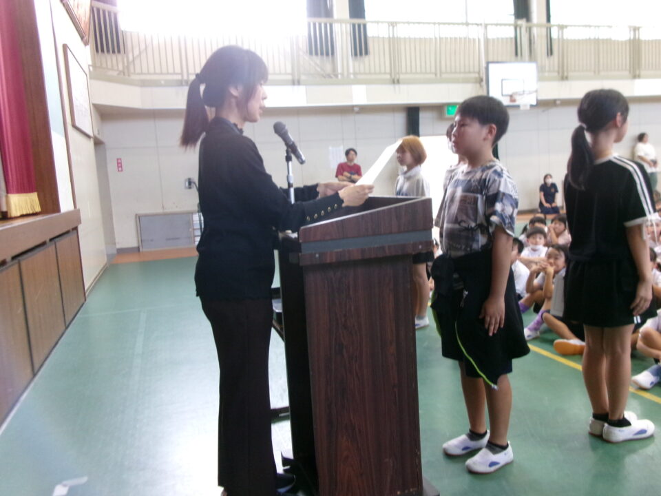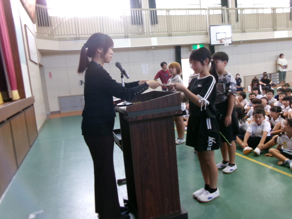 水泳の大会や絵画コンクールで優秀な成績を収めたことで、伝達表彰を行いました。がんばりましたね!!
