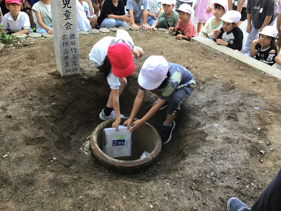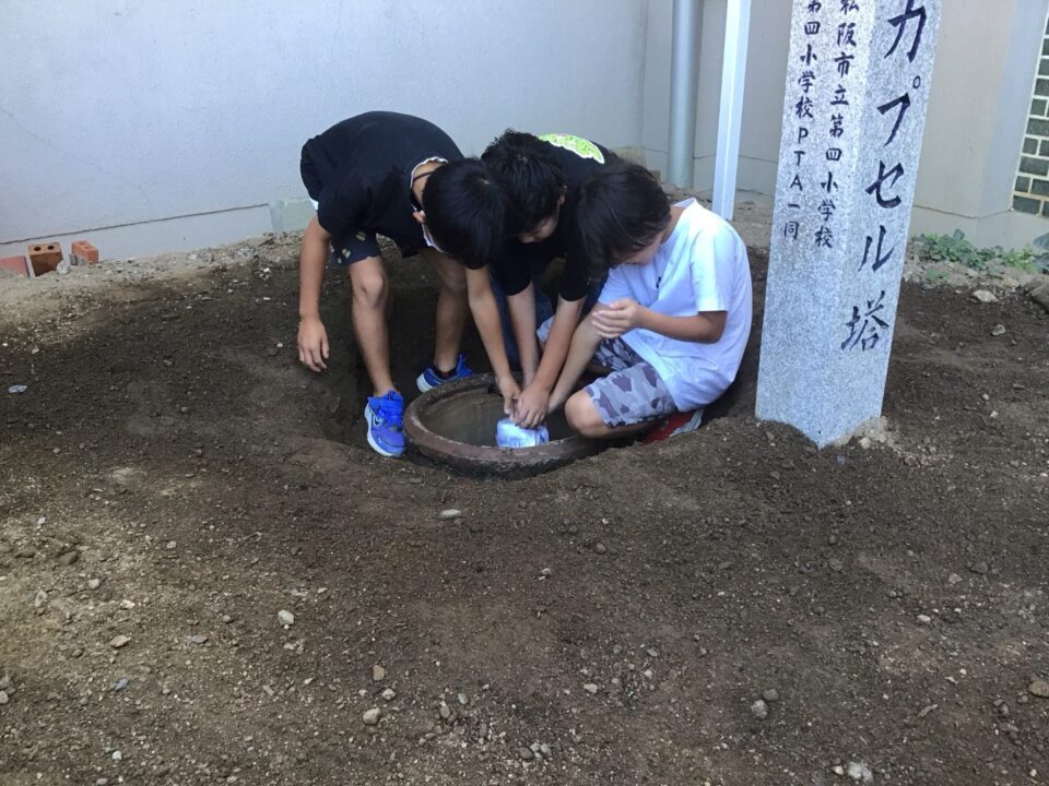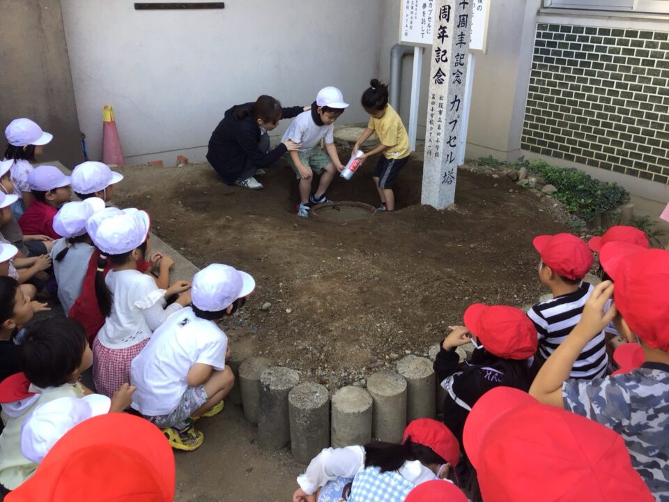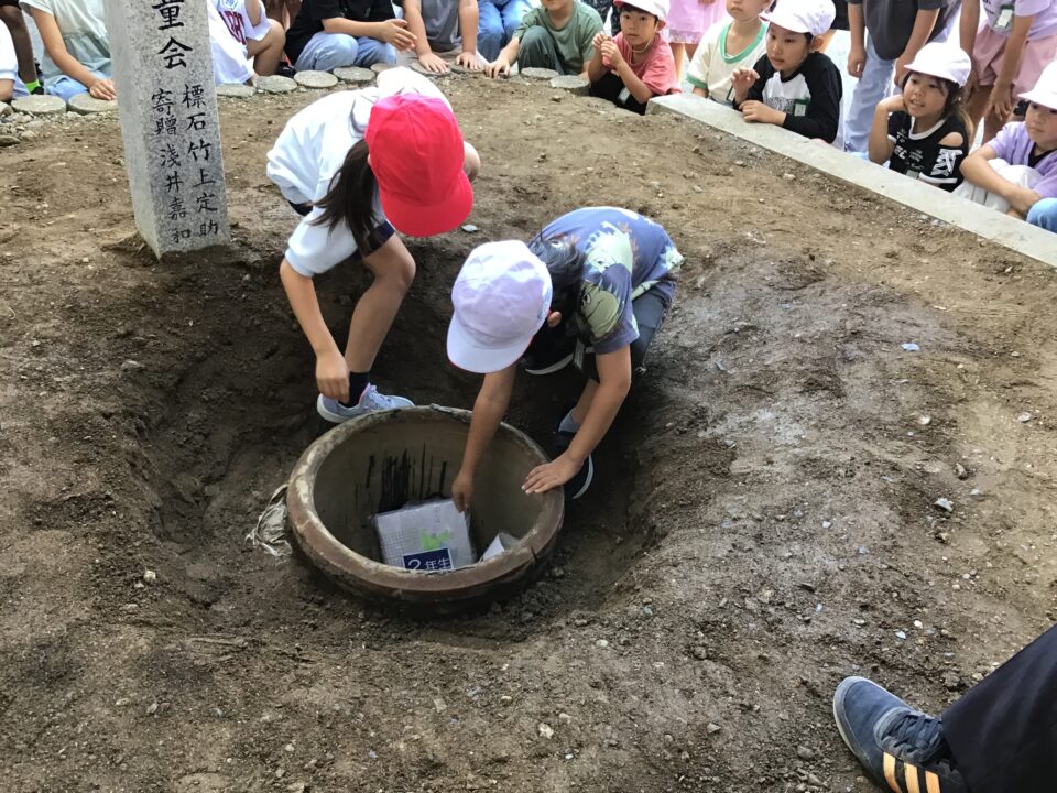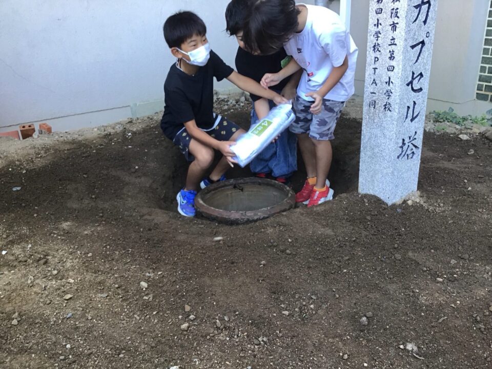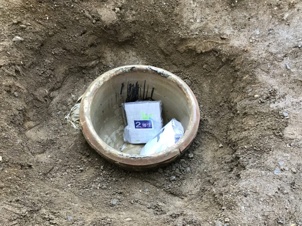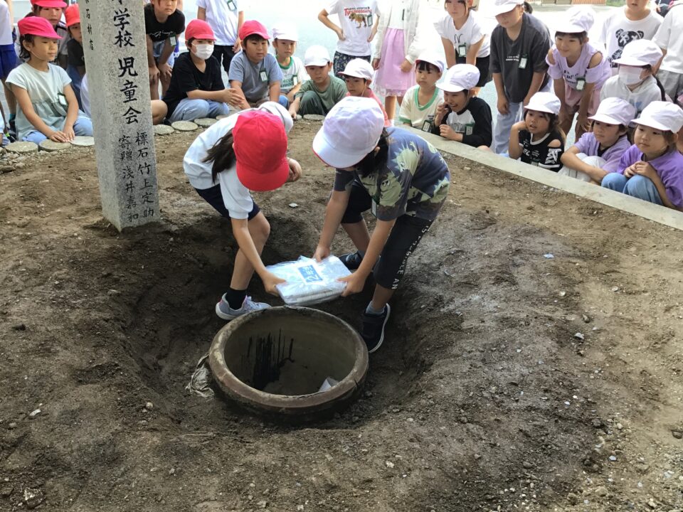 どもたちは、30年後ねんご未来みらいゆめたくして、タイムカプセルに作品さくひんれました。
