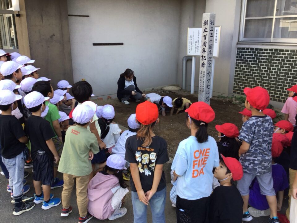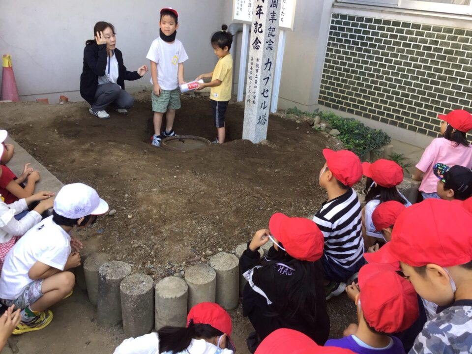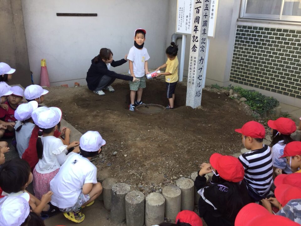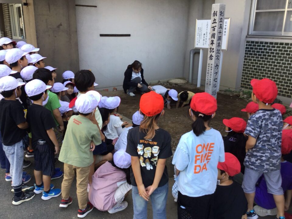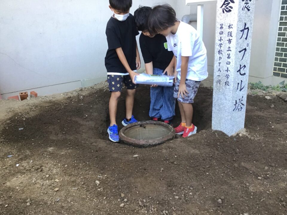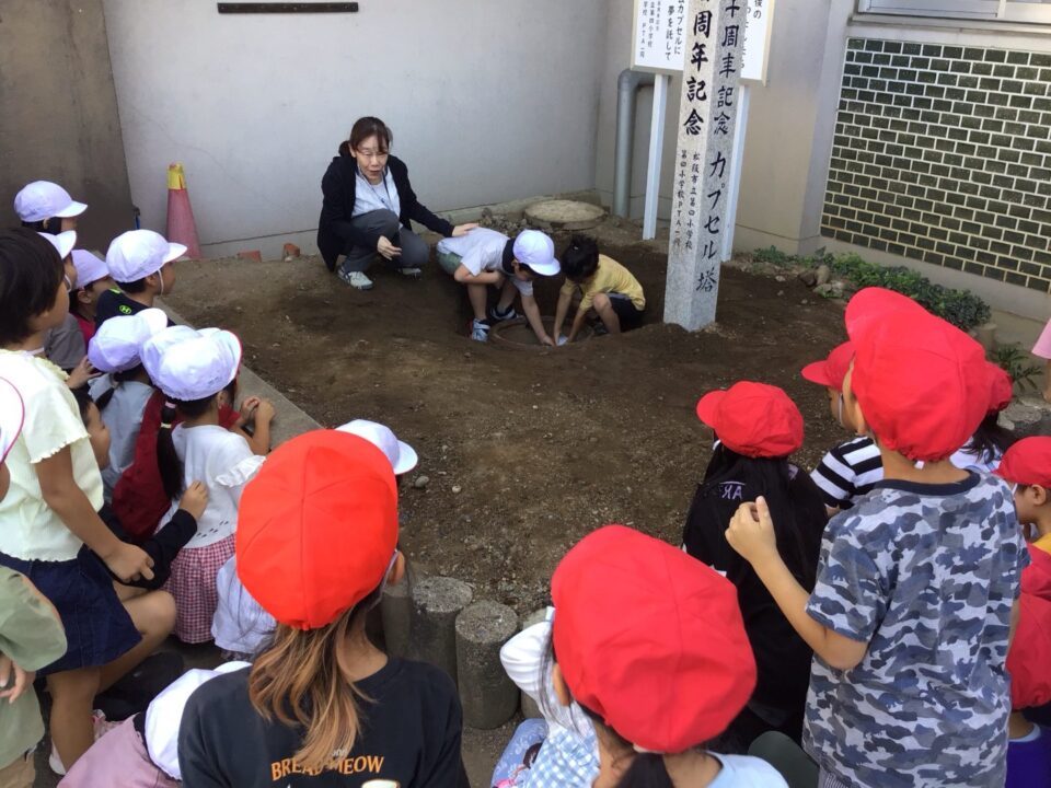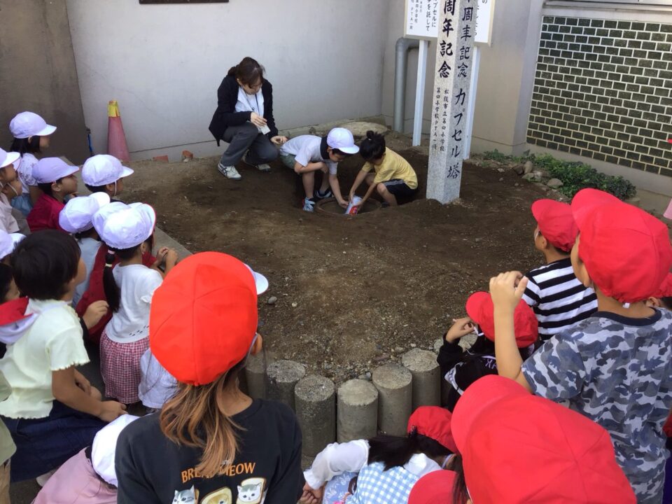 どもたちは、30年後ねんご未来みらいゆめたくして、タイムカプセルに作品さくひんれました。