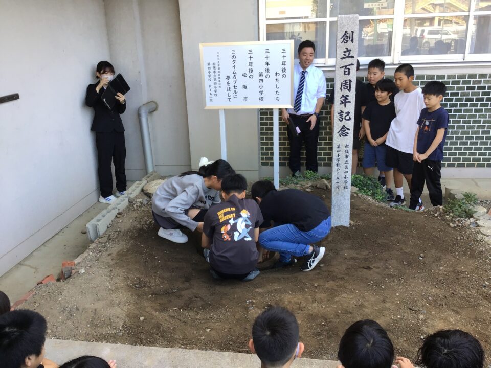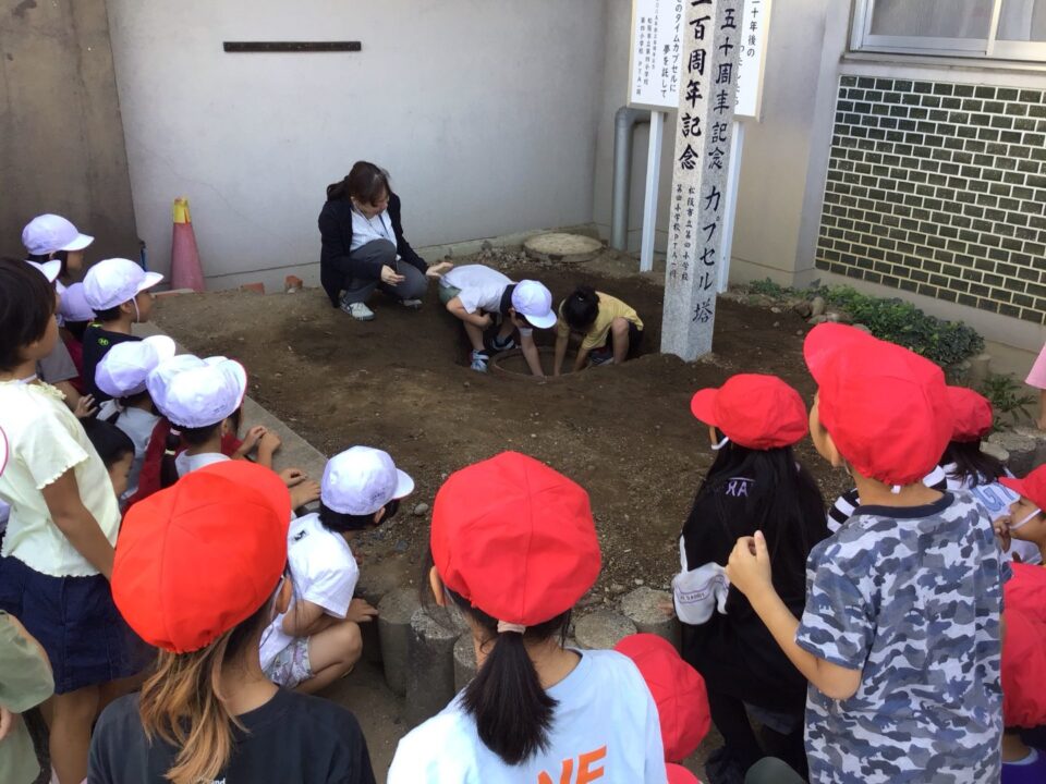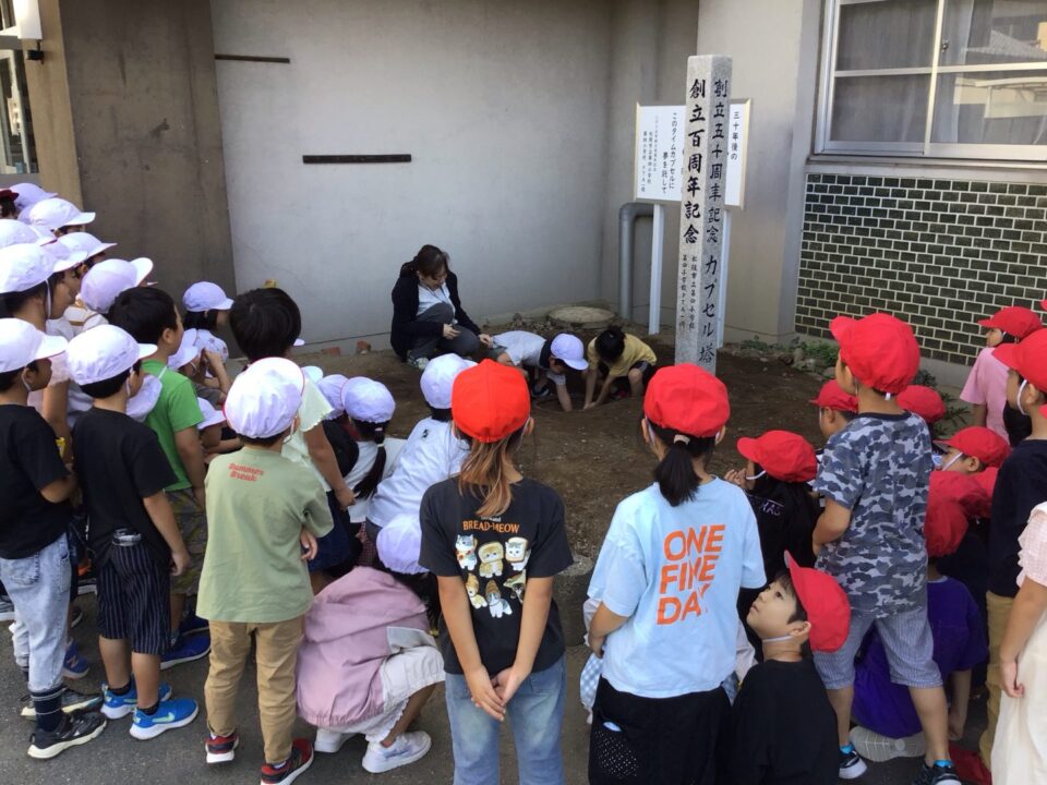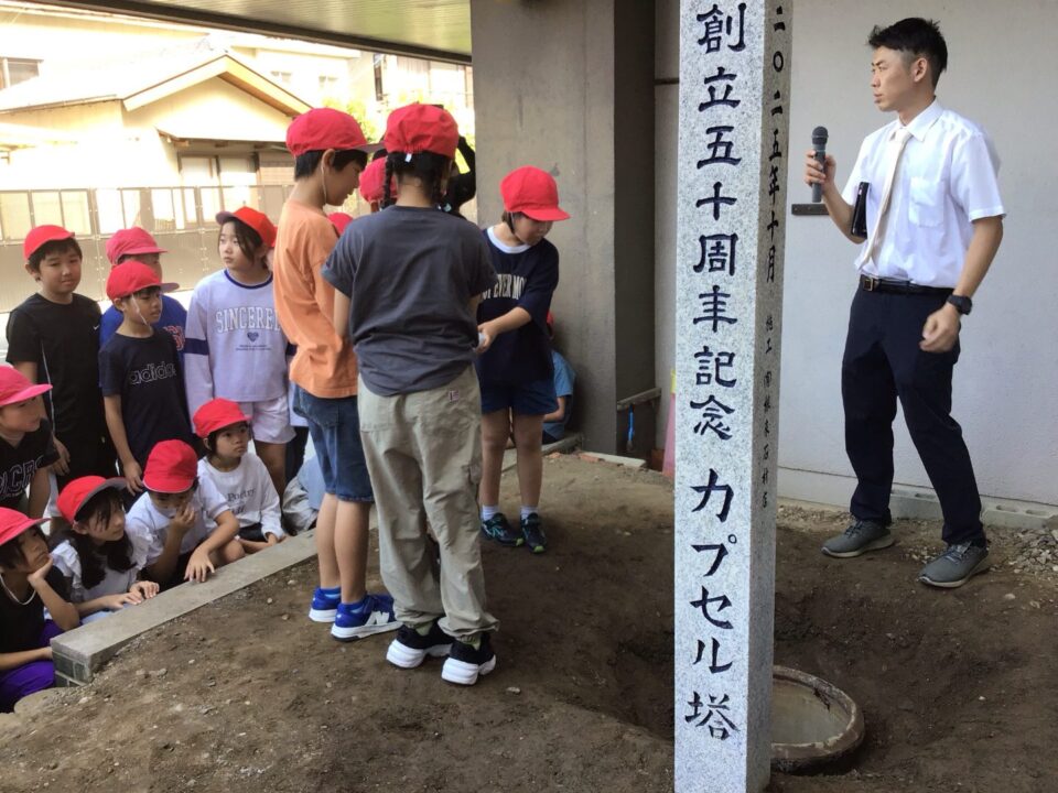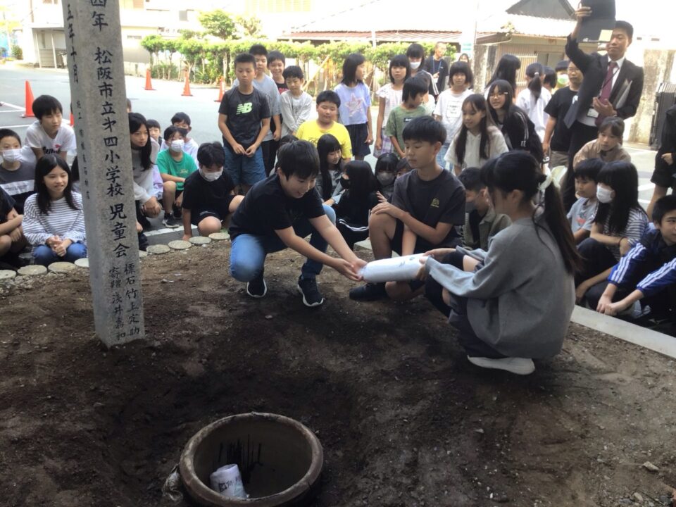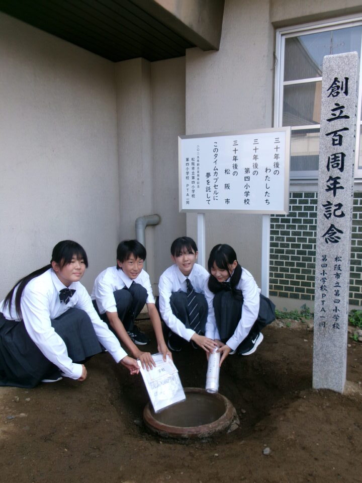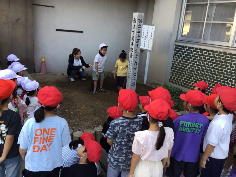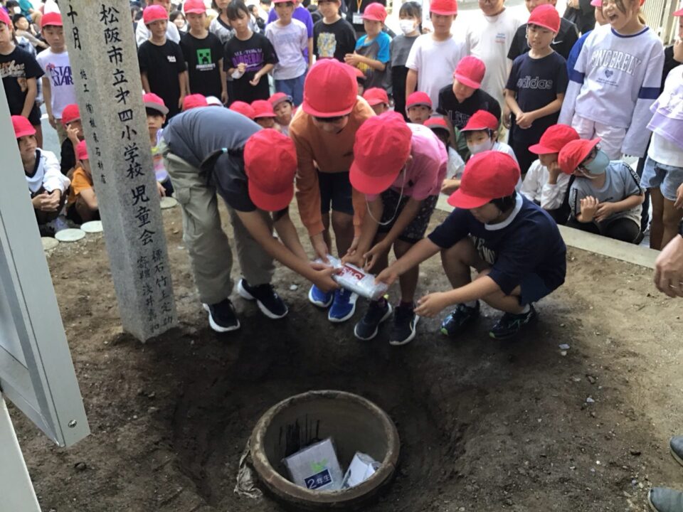 どもたちは、30年後ねんご未来みらいゆめたくして、タイムカプセルに作品さくひんれました。