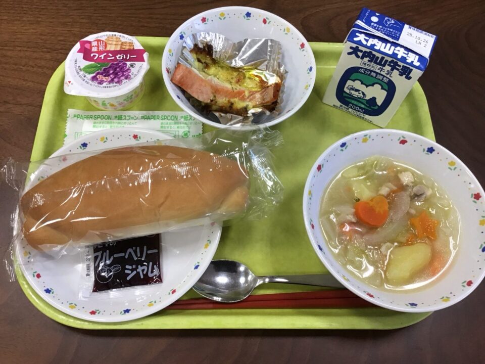 今日の給食は、コッペパン、牛乳、さけの黄金焼き、ポトフ、ブルーベリージャムでした。