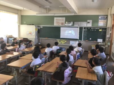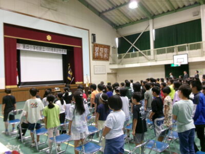 今日は、記念式典を行いました。会場には、4年生~6年生が参加し、1年生~3年生は、オンラインで参加しました。