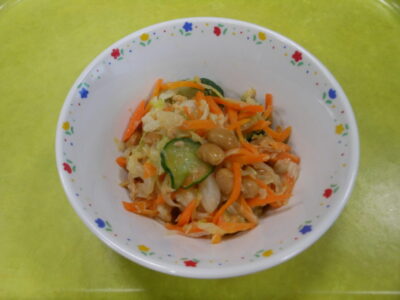 今日の給食は、チキンカレー(麦入り)、牛乳、大豆入りサラダでした。