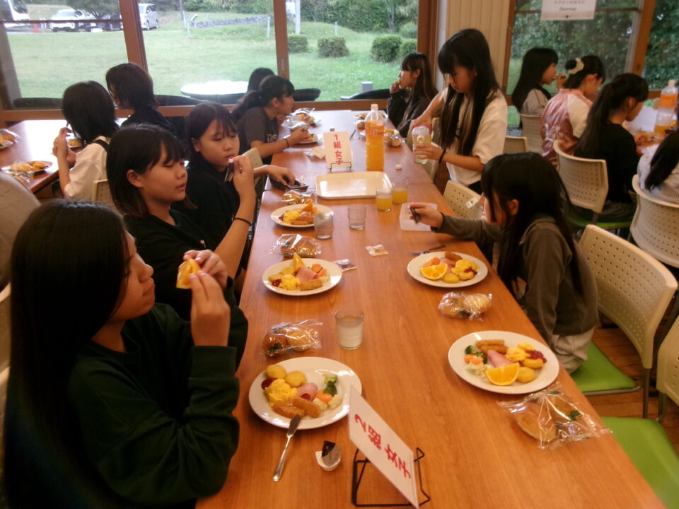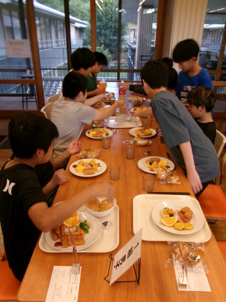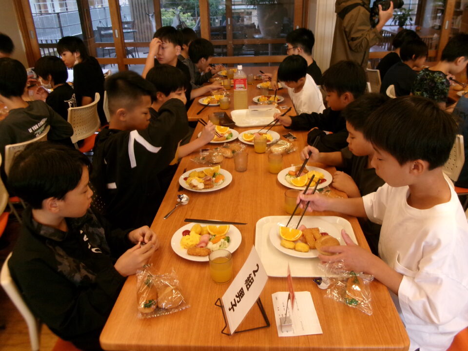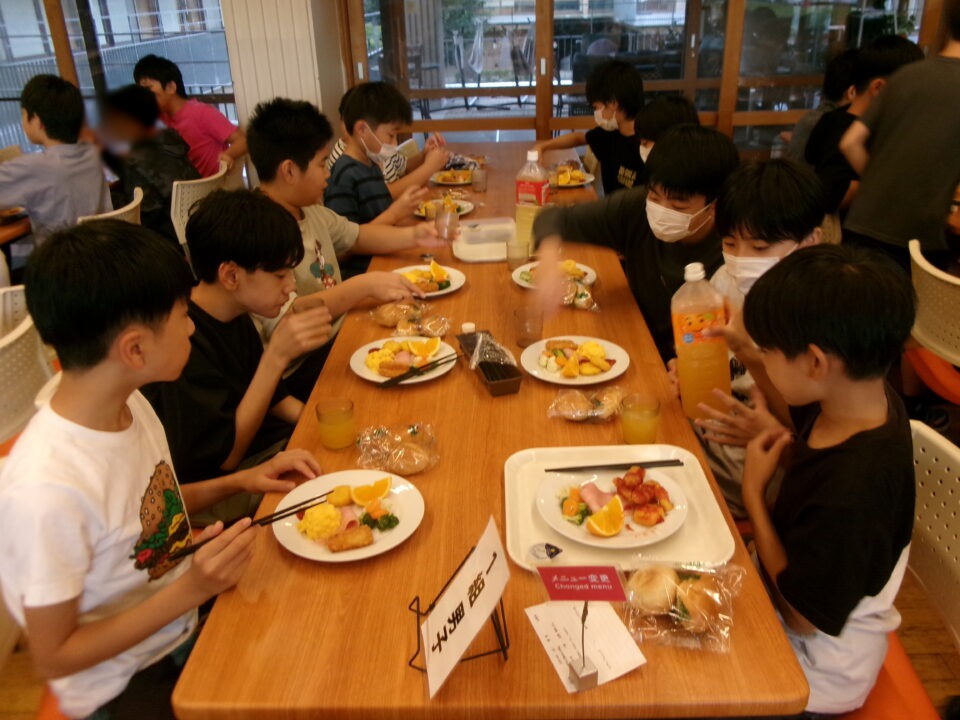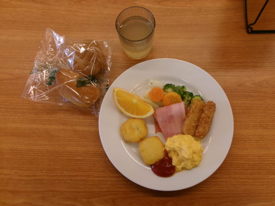 食堂しょくどう朝食ちょうしょくべました。パンとジュースはおかわり自由じゆうです。