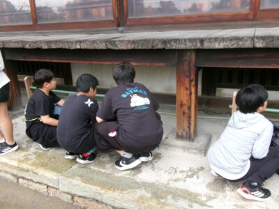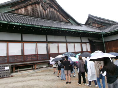 ホーム > 学校活動の様子 二条城見学(にじょうじょうけんがく) 体験(たいけん)を終(お)え、次(つぎ)は二条城(にじょうじょう)の見学(けんがく)でした。ここは、江戸幕府(えどばくふ)の最後(さいご)、徳川慶喜(とくがわよしのぶ)が大政奉還(たいせいほうかん)をした部屋(へや)あるところです。 うぐいすばりの廊下(ろうか)も体験(たいけん)してきました。 二条城(にじょうじょう)の見学(けんがく)の時(とき)は、小雨(こさめ)が降(ふ)り、傘(かさ)をさしながら庭(にわ)からうぐいすばりの仕組(しく)みについて学(まな)びました。 シェアする Twitter でシェア はてなブックマークに保存 LINE でシェア Facebook でシェア Pocket に保存 Feedly で購読 関連投稿 学校活動の様子 4年生 ミニコンサート 学校活動の様子 豪華(ごうか)な卒業(そつぎょう)お祝(いわ)い給食(きゅうしょく) 学校活動の様子 給食感謝(きゅうしょくかんしゃ)の会(かい) 学校活動の様子 修了式・離任式 学校活動の様子 運動会(うんどうかい)に向(む)けて練習(れんしゅう)が始(はじ)まりました。 学校活動の様子 サッカークラブ結成 前の投稿 丸益西村屋(まるますにしむらや)さんでの友禅染(ゆうぜんぞ)め体験(たいけん) 次の投稿 最後(さいご)は、京都太秦映画村(きょうとうずまさえいがむら)