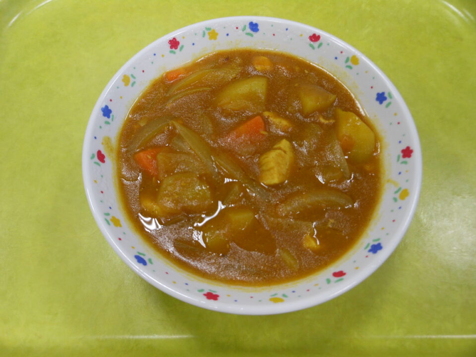 今日の給食は、チキンカレー(麦入り)、牛乳、大豆入りサラダでした。