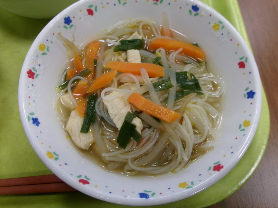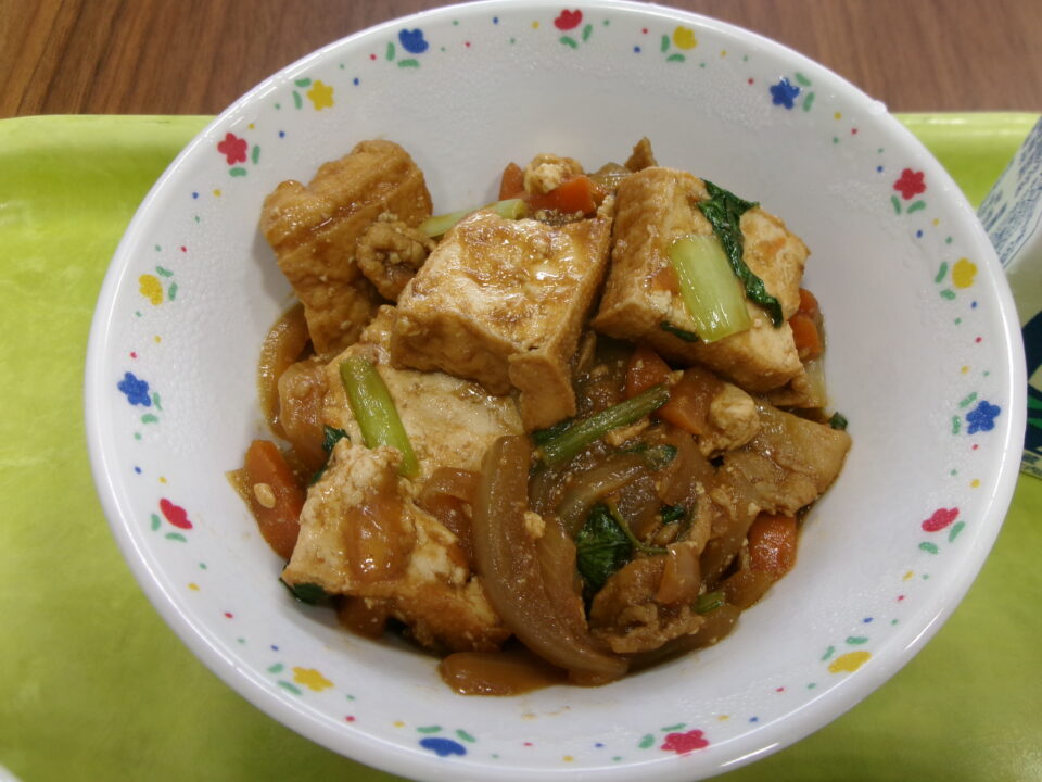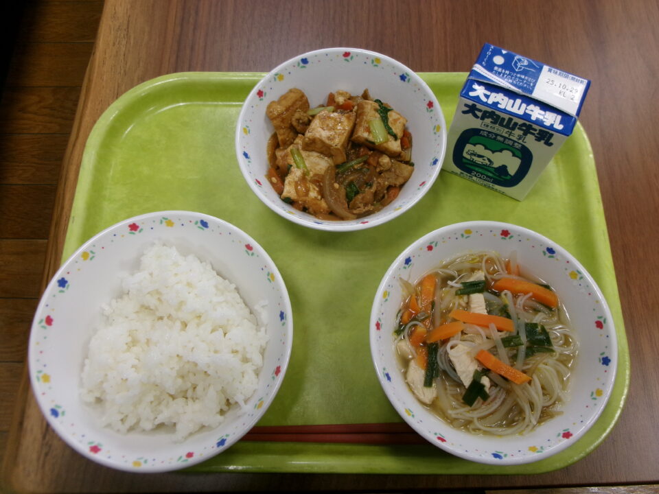 今日の給食は、ご飯、牛乳、厚揚げと豚肉のピリ辛炒め、ビーフン入りもやしのスープでした。